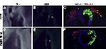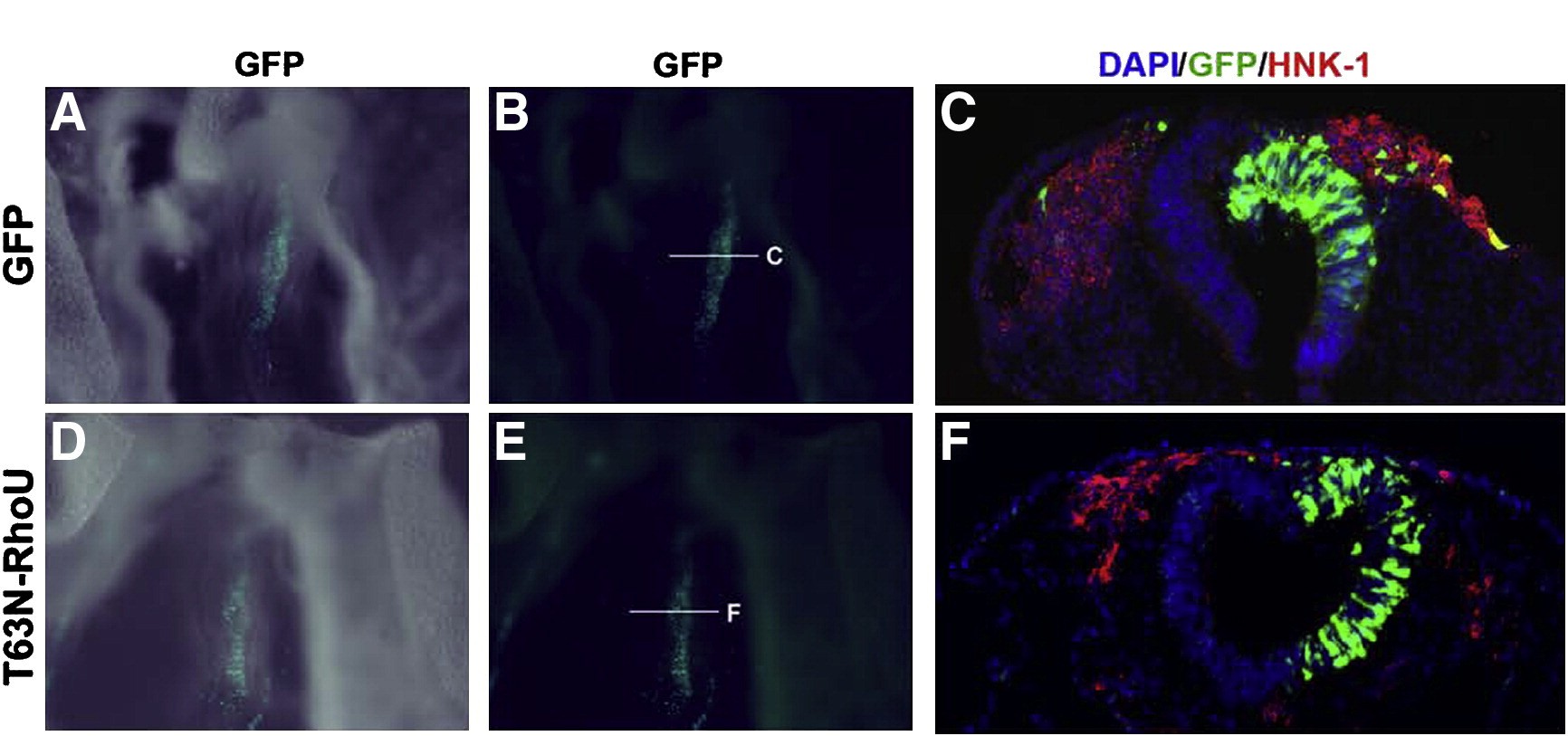 Fig. 3. RhoU loss-of-function in the chick embryo blocks CNC cell emigration and migration. Electroporations of pCAGGS-IRES-nls-GFP plasmid alone or together with pCS2-T63N-RhoU into the midbrain region of chick embryos at the 2 somite stage. Embryos were allowed to develop until the 9 somite stage. (A, B, D, E): whole-mount GFP stainings. (C, F): immunohistochemistry analysis of HNK-1 expression in transverse sections at levels indicated in B and E. In all panels, the electroporated side is on the right |