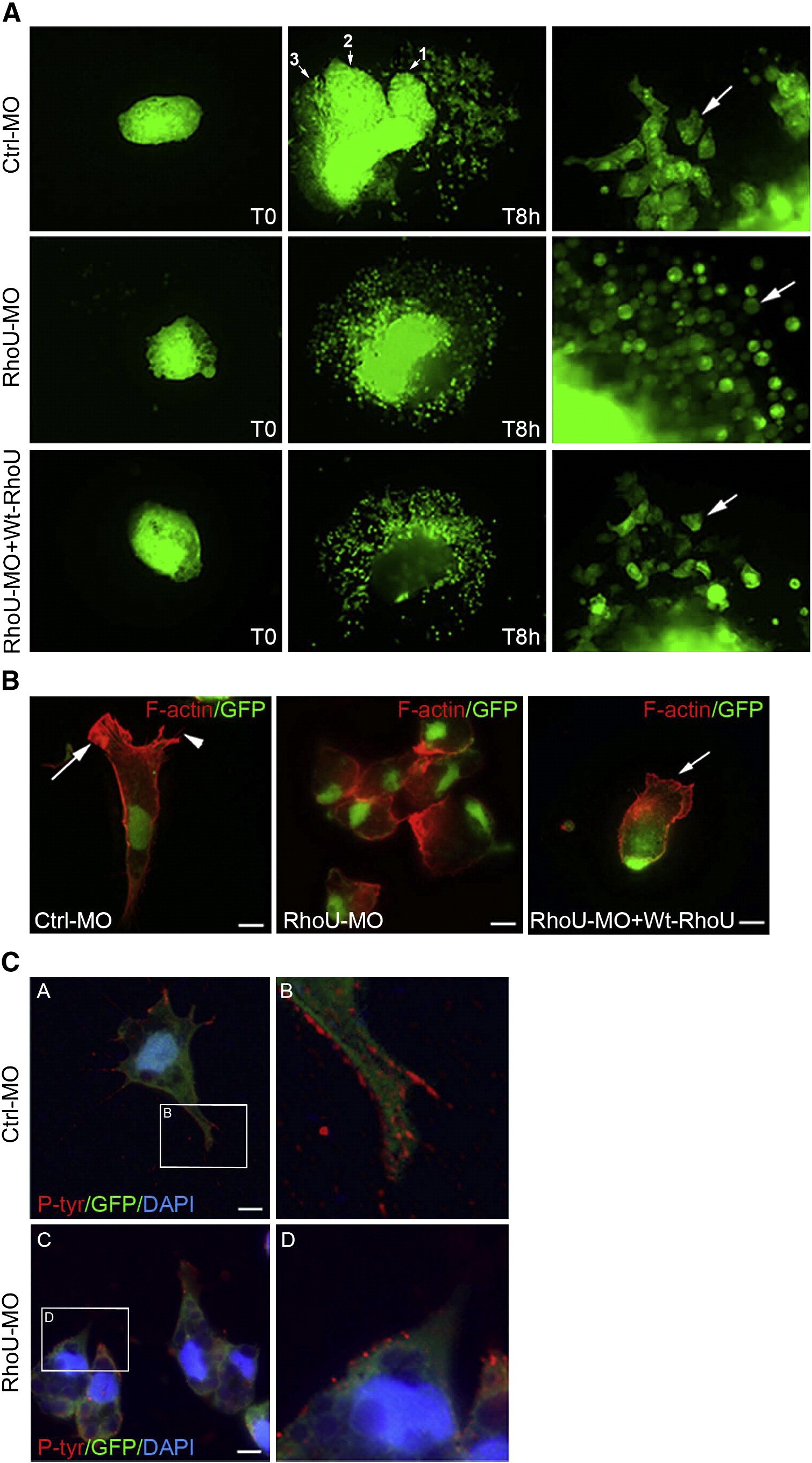 Fig. 4. RhoU is required for CNC cell explants to spread and segregate on fibronectin matrix. (A) Xenopus embryos were injected in one cell of two-cell stage with 300 pg GFP mRNA plus control MO (Ctrl-MO) or RhoU-MO. At stage 17, CNC explants were excised as described (Alfandari et al., 2003) and plated on fibronectin-coated substrates. Shown are images at plating (T 0) and 8 h later (T 8 h). By 8 h, control-MO expressing explants (upper panels) spread extensively and segregated into three lobes. However, RhoU-MO-injected explants failed to spread on fibronectin substrate but dissociated into loose and rounded cells (middle panels). Co-injection of 225 pg GFP-Wt-RhoU mRNA partially rescued the effect (lower panels). (B) Analysis of CNC cell protrusions. Staining for GFP (green) and F-actin (red) were merged. Arrows indicate lamellipodia and arrowheads filopodia. All RhoU-MO- injected cells analyzed showed the same phenotype. Co-injection of GFP-Wt-RhoU mRNA restored protrusions in RhoU-MO depleted embryos. Bar, 10 μM. Co-injected cells shown are representative of 68% observed cells (n = 150). (C) Analysis of CNC focal adhesions in control MO (Ctrl-MO) (panel A) and RhoU-MO (panel C) embryos. Staining for phospho- tyrosine (red), GFP (green), and DAPI (blue) were merged. Panels B and D show higher magnifications of the boxed areas of panels A and C, respectively. RhoU-MO-injected cells shown are representative of 82% observed cells (n = 150). Bar, 10 μM. |