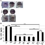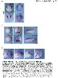 Fig. 2. rhoU mRNA is expressed in Xenopus migrating CNC cells and is required for migration. (A) RhoU knock-down elicits the loss of neural crest derivatives. 4 cell stage Xenopus embryos were injected with nuclear β-galactosidase mRNA plus control MO (Ctrl-MO) or RhoU-MO and then fixed at stage 45. Shown are Ctrl-MO (a, b) and RhoU-MO-injected embryos (c, d) representative of the observed skeletal defects. Dorsal views (a, c), ventral views (b, d). The injected side is on the right, as monitored by the co-injected β-galactosidase mRNA lineage tracer (red staining) and indicated by white arrows. (e) Drawing of ventral cranial cartilages modified from Sadaghiani and Thiebaud (1987) and Spokony et al. (2002). Neural crest derived cartilages are marked as: Me, Meckel's cartilage; Ce, cerathoyal cartilage; Ba, basihyal cartilage; Br, branchial/gill cartilage. (f, g) Skeletal structures from Ctrl-MO (f) and RhoU-depleted (g) stage 45 tadpoles were stained with alcian blue on flat-mount embryos. Arrows in g use the same color code as in e. (B) RhoU knock-down impairs CNC cell migration. 4-cell stage embryos were co-injected into a single cell with nuclear β-galactosidase mRNA plus control MO (Ctrl-MO) or RhoU-MO. Dorsal views of stage 22 embryos, injected sides (red staining) are on the right. (a) Twist and (c) slug and stainings on RhoU-MO injected embryos. (b) Twist staining on control MO (Ctrl-MO) injected embryo. RhoU depletion inhibits CNC cell migration into pharyngeal arches (black arrows). (c) Krox-20 ISH showed that CNC cells did not migrate into the third branchial arch in RhoU-MO morphants, while expression in the hindbrain was not affected. (d) Co-injection of 200 pg GFP-Wt-RhoU mRNA, insensitive to RhoU-MO, rescued CNC cell migration, as evidenced by the krox-20 staining in the third branchial arch (black arrow). (C) Graph summarizing the results of three independent injection experiments as described in B. NIS, non-injected control side; Ctrl-MO, control side injected with control MO; n, total number of embryos analyzed. *** indicates conditions statistically different (pb0.001). (D) RhoU function in the CNC cell is cell-autonomous. 4-cell stage embryos Xenopus embryos were injected in one cell with 300 pg GFP mRNA plus control MO (Ctrl-MO) or RhoU- MO. At early neurula stages, correctly targeted embryos were identified using a fluorescence-equipped dissecting microscope. CNC explants were then grafted into uninjected control embryos, as schematized. CNC cell migration was normal in GFP grafts (white arrow) while it was impaired in RhoU-depleted grafts (white arrowheads). (E) Graph summarizing the results of three independent graft experiments as described in D. NIS, non-injected-side; n, total number of embryos analyzed. *** indicates conditions statistically different (pb0.001). |