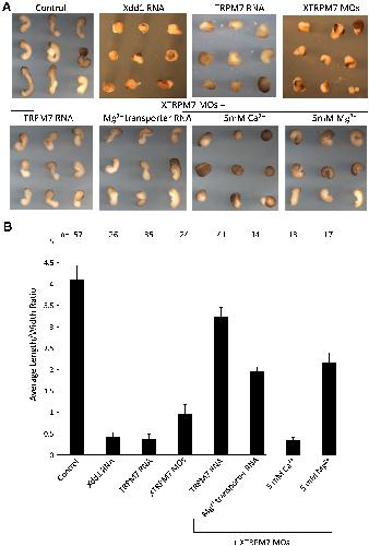 Fig. 3. XTRPM7 is required for convergent extension movements. (A) Dorsal marginal zone (Keller) explant assay revealed that overexpression of TRPM7 (2 ng) and injection of XTRPM7 MOs inhibit convergent extension movements. Dominant negative Dishevelled (Xdd1, 2 ng) was used as a positive control. Inhibition of convergent extension produced by depletion of XTRPM7 was rescued by co-injection of XTRPM7 MOs with TRPM7 RNA (400 pg) and the Mg2+ transporter SLC41A2 (400 pg), as well as supplementation of the buffer with 5 mM Mg2+ but not 5 mM Ca2+. (B) Quantification of Keller explant assay; bars indicate the average length to width ratio of Keller explants and the number of explants analyzed is shown above each bar.