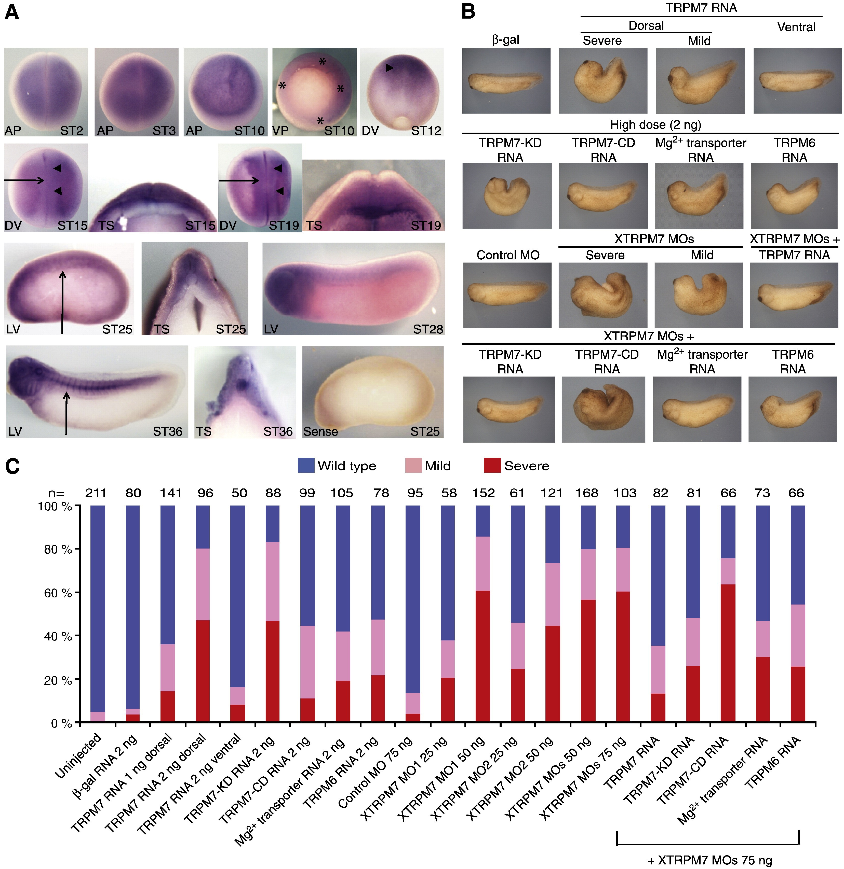 Fig. 1. XTRPM7 is required for gastrulation. (A) Expression pattern of XTRPM7 at selected developmental stages as analyzed by whole-mount in situ hybridization using a TRPM7 anti-sense probe. A sense probe was used as a negative control. XTRPM7 is expressed at higher levels in the dorsal mesoderm and neural plate (stars and arrowheads, respectively), which is associated with dynamic morphogenesis movements. Arrows indicate the region where the embryo was vertically sectioned and examined. AP: Animal pole; VP: Vegetal pole; DV: dorsal view; TS: transverse section; LV: lateral view; ST: stage (B) Injection of TRPM7 RNA (2 ng) dorsally, but not ventrally, inhibited gastrulation resulting in embryos with curved axes, open neural folds, and reduced anterior structures. Dorsal injection of the kinase-dead TRPM71618D (TRPM7D, 2 ng), but not the channel-dead TRPM71047K (TRPM7-CD, 2 ng), produced a similar phenotype. In addition, dorsal injection of TRPM6 (2 ng) and the Mg2+ transporter SLC41A2 (2 ng) RNAs also produced gastrulation defects. Dorsal injection of XTRPM7 MOs (37.5 ng each) inhibited gastrulation, and this phenotype was rescued by co-injection of XTRPM7 MOs with TRPM7 RNA (400 pg), TRPM7-KD RNA (400 pg), and TRPM6 RNA (400 pg) as well as by SLC41A2 (Mg2+ transporter) RNA (400 pg). However, co-injection of TRPM7-CD RNA with the XTRPM7 MOs did not rescue the XTRPM7 MO-induced gastrulation phenotypes. Injections were performed into the dorsal or ventral marginal zone of the four-cell embryo, and the phenotypes were scored at the tadpole stage. (C) Quantification of the phenotypic results from overexpression of TRPM7 or depletion of XTRPM7; the number of embryos examined is shown above each bar.