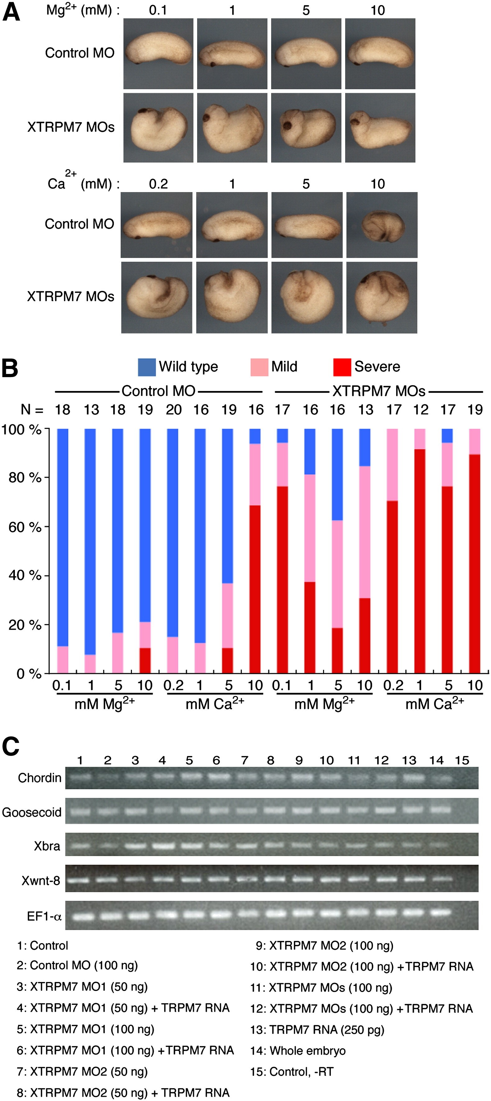 Fig. 2. Mg2+ is required for gastrulation. (A) Dorsal injection of XTRPM7 MOs (75 ng) in embryos cultured in 0.1MMR (0.1 mM Mg2+) inhibited gastrulation. Supplementation of Mg2+, but not Ca2+, into the culture media at 5 mM at stage 10.5 rescued the gastrulation phenotype. (B) Quantification of the effects of Mg2+ and Ca2+ supplementation on embryos injected with XTRPM7 MOs; the number of embryos is shown above each bar. (C) Embryos injected dorsally with XTRPM7 MOs or TRPM7 RNA had no defects in expression of mesodermal marker genes Chordin, Goosecoid, Xbra and XWnt8 as monitored by RT-PCR analysis; EF1-α was used as a loading control.
