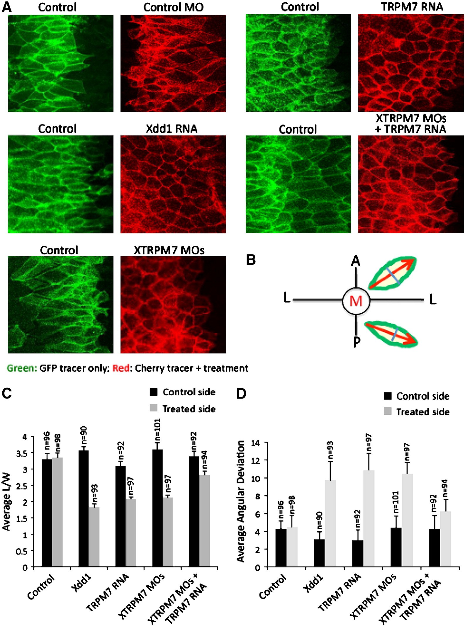 Fig. 4. XTRPM7 is required for dorsal mesodermal cell polarization, elongation and alignment. (A) Confocal imaging analysis revealed that injection of TRPM7 RNA and XTRPM7 MOs inhibits dorsal mesodermal cell polarization and elongation. Control cells were labelled with EGFP-CAAX (green, 500 pg) and membrane-tethered Cherry (red, 500 pg) was co-injected with either TRPM7 RNA (2 ng), dominant negative Dishevelled (Xdd1) RNA (2 ng), XTRPM7 MOs (75 ng), or XTRPM7 MOs (75 ng) and TRPM7 RNA (400 pg). (B) Illustration of calculations of average length to width ratio and average angular deviation. Length to width ratio was measured by taking the length of the cell (red arrow) divided by the width of the cell (blue line). Angular orientation of the cell was measured by taking the absolute value of the angle of the red arrow in reference to the lateral axis (L) and was used for calculations of average angular deviation. (C) Injection of Xdd1 RNA and TRPM7 RNA or injection of the XTRPM7 MOs disrupted dorsal mesodermal cell elongation as quantified by the length/width ratio of cells. The error bars represent the standard deviation (s.d.) from at least three independent experiments and the number of cells examined is shown at the top of each bar. (D) Injection of Xdd1 RNA and TRPM7 RNA or injection of the XTRPM7 MOs disrupted alignment of dorsal mesodermal cells undergoing convergent extension. The error bars represent the s.d. from at least three independent experiments and the number of cells examined is shown at the top of each bar.