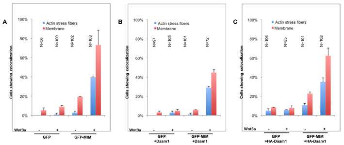Fig. S2. Quantification of the subcellular localization studies shown in Fig. 2. (A-C) Quantification of Fig. 2A (A), Fig. 2B (B) and Fig. 2C (C). Blue bar indicates transfected cells with localization of GFP or GFP-MIM to actin stress fibers, whereas the red bar indicates localization of GFP or GFP-MIM to the plasma membrane. Sample size (N) is shown above each bar. Error bars indicate standard deviation of the mean. |