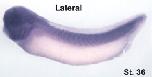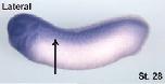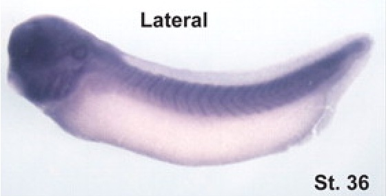 mtss1.2 (metastasis suppressor 1, gene 2) gene expression in Xenopus laevis embryo, assayed via in situ hybridization, NF stage 28, lateral view, anterior left, dorsal up. |