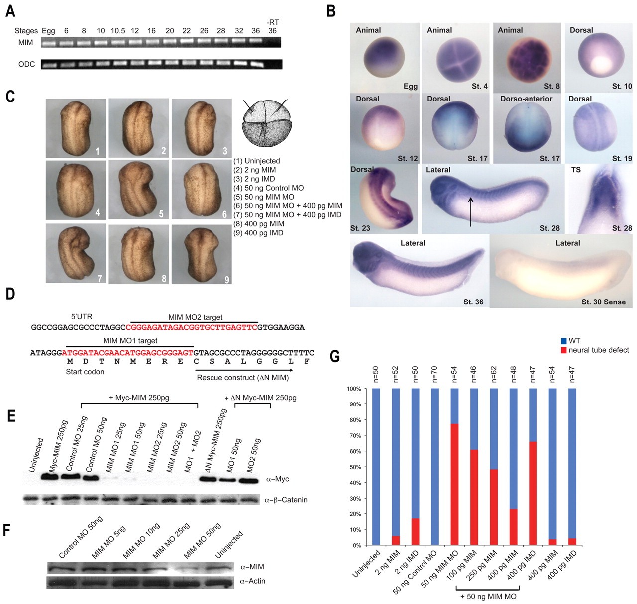 Fig. 4. Temporal and spatial expression pattern of MIM and regulation of anterior neural fold closure by MIM. (A) Xenopus MIM (XMIM) is expressed throughout development as monitored by RT-PCR analysis. ODC is used as a loading control; âRT, without reverse transcriptase. (B) The spatial expression pattern of XMIM is dynamic, with highest expression observed in the neural folds of the neurula stage embryo. Stages and views of the embryos are indicated. No signal is detected using a XMIM sense probe. Arrow indicates the plane of the transverse section (TS). (C) Injection of MIM or IMD RNA produces no morphological defects in the Xenopus embryo, whereas injection of MIM MO (50 ng) dorsally inhibits anterior neural fold closure. The MIM MO phenotype can be effectively rescued by co-injection of 400 pg δN MIM RNA. (D) Location of the MIM MO target sequences; these are absent from the MIM rescue construct (δN MIM), which only includes sequence downstream of the MO1 target. (E) Injection of MIM MO1 or MO2 inhibits translation of Myc-MIM but not of endogenous β-catenin. (F) Injection of MIM MO1 inhibits translation of endogenous MIM but not of endogenous actin in the Xenopus embryo. (G) Quantification of the results of C. The number of injected embryos analyzed is shown above each bar. |