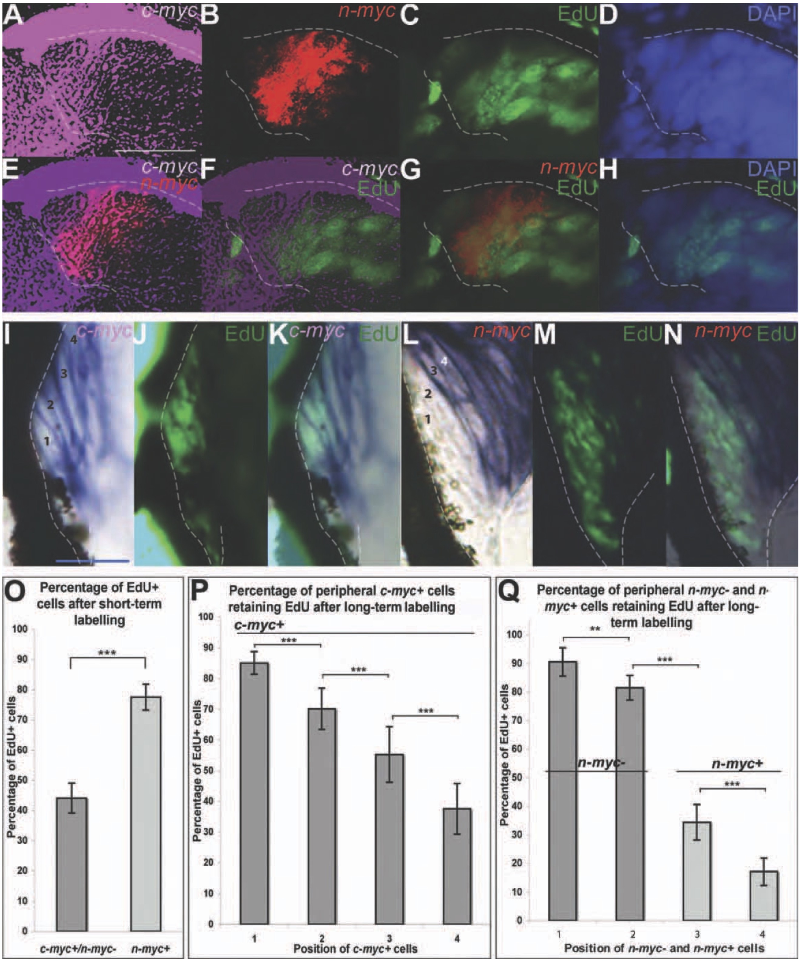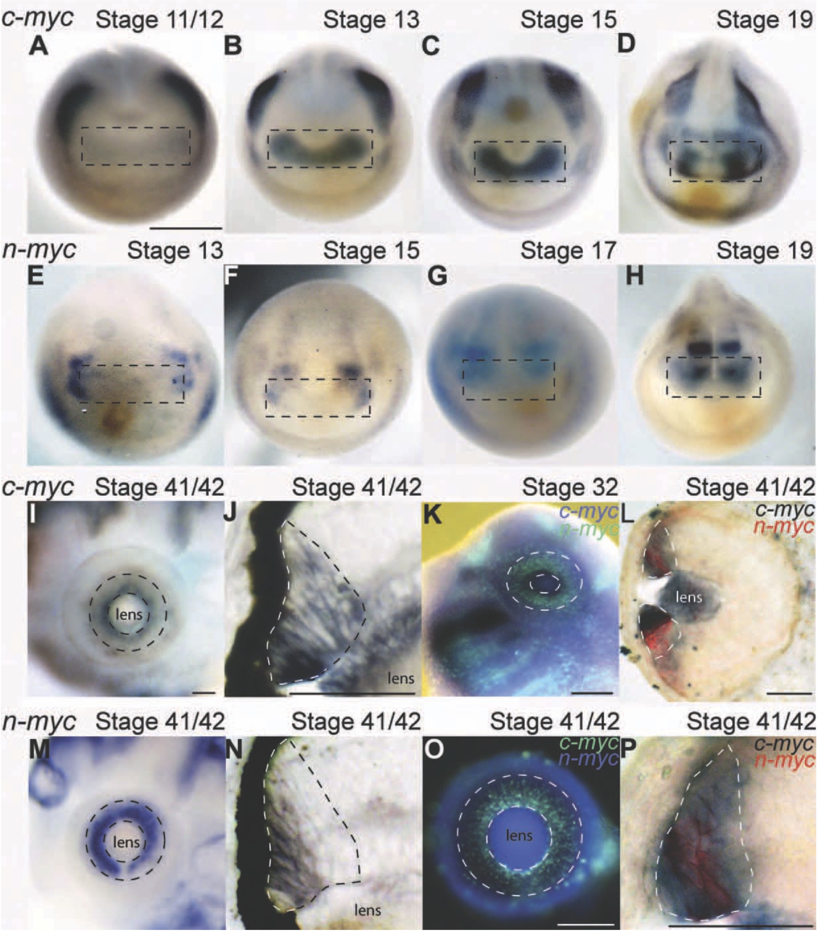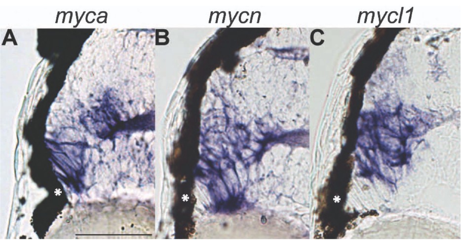 The ciliary marginal zone (CMZ) of fish and frog retinas contains cells that proliferate throughout postembryonic development as the retina grows with increasing body size, indicating the presence of stem cells in this region. However, neither the location nor the molecular identity of retinal stem cells has been identified. Here, we show in Xenopus that c-myc and n-myc are sequentially expressed both during development and in the post-embryonic retina. The c-myc+/n-myc- cells near the extreme periphery of the CMZ cycle more slowly and preferentially retain DNA label compared to their more central cmyc+/n-myc+ neighbors which cycle rapidly and preferentially dilute DNA label. During retinal development c-myc is functionally required earlier than n-myc, and n-myc expression depends on earlier c-myc expression. The expression of c-myc but not n-myc in the CMZ depends on growth factor signaling. Our results suggest that c-myc+/n-myc- cells in the far peripheral CMZ are candidates for a niche-dependent population of retinal stem cells that give rise to more centrally located and rapidly dividing n-myc+ progenitors of more limited proliferative potential. Analysis of homologues of these genes in the zebrafish CMZ suggests that the transition from c-myc to n-myc expression might be conserved in other lower vertebrates whose retinas growth throughout life.