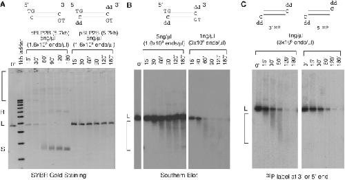 Figure 1. Establishment of cytosol as a system for studying 5′- strand processing. (A) A dideoxynucleotide at the 3′-end blocks NHEJ. A 5.7 kb linear DNA (pBLP) with either dC or ddC at the 3′- end was incubated in cytosol at 5 ng/µl. Samples were taken at the indicated times, treated with SDS–proteinase K and separated on a 1% TAE–agarose gel. DNA was detected by SYBR Gold staining. L: linear substrate. S: supercoiled monomer product. Bracket: dimers, trimers and multimers. (B) Effect of DNA concentration on 5′-strand processing. DNA with ddC-terminated 3′-ends was incubated in cytosol at 5 ng/µl and 1 ng/µl concentrations. Samples were processed as in (A), transferred to a Nylon membrane, and detected by Southern hybridization with a 32P-labeled probe. L: liner substrate. Bracket: intermediates. (C) Differential fate of 5′- and 3′ 32P-label during 5′ strand processing. 5′- or 3′-labeled DNA with ddC-terminated 3′-ends was incubated in cytosol for the indicated times and separated by gel electrophoresis as in (A). The gel was dried and the 32P signal was detected by exposure to an X-ray film.