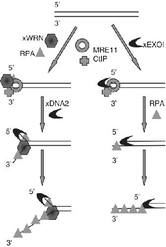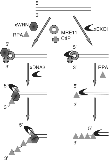 Figure 8. Model for the 5′-strand-specific processing of DNA ends. xWRN-xDNA and xEXO1 constitute two parallel pathways. MRN and CtIP act with xWRN-xDNA2 and xEXO1 in the initiation step, but are dispensable after partial degradation of the 5′-strand.