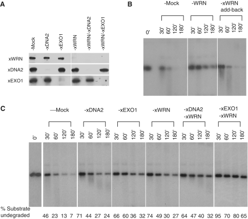 Figure 6. Effect of xEXO1 and xWRN co-depletion on 5′-strand processing. (A) Western showing the depletion of xEXO1, xWRN, and xDNA2. (B) Effect of xWRN single depletion on 5′-strand processing. The 3′-32P-labeled linear pBLP DNA with ddC-blocked ends (1 ng/µl) was incubated in mock-depleted cytosol or xWRN-depleted cytosol (supplemented with either buffer or the purified xWRN). Time points were treated with SDS–proteinase K and analyzed on a 1% TAE–agarose gel. (C) Effect of xEXO1-xWRN and xDNA2-xWRN double depletions on 5′-strand processing. Cytosol depleted of the indicated proteins were incubated with the 3′-32P-labeled and ddC-blocked linear pBLP (1 ng/µl). The reactions were treated and analyzed similarly to that in (B). The percentage of remaining DNA substrate was calculated relative to the total input DNA.