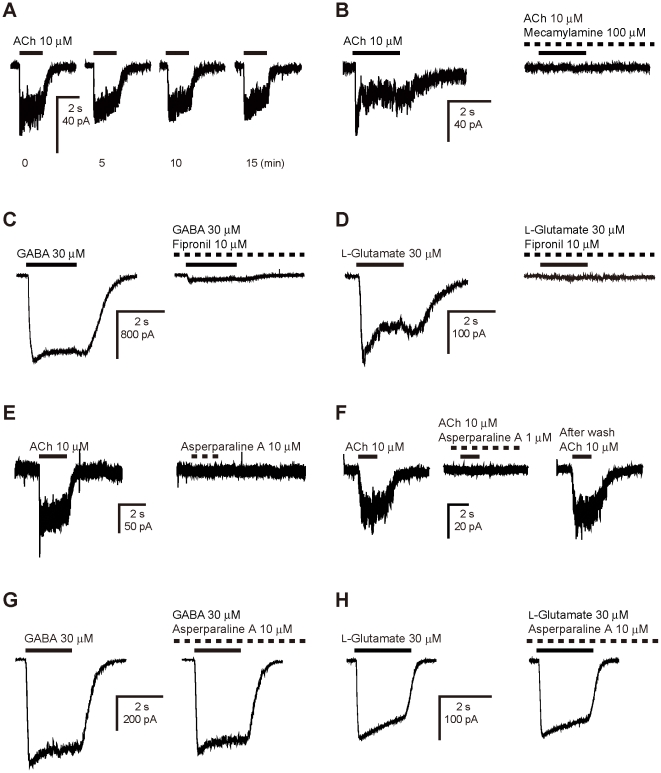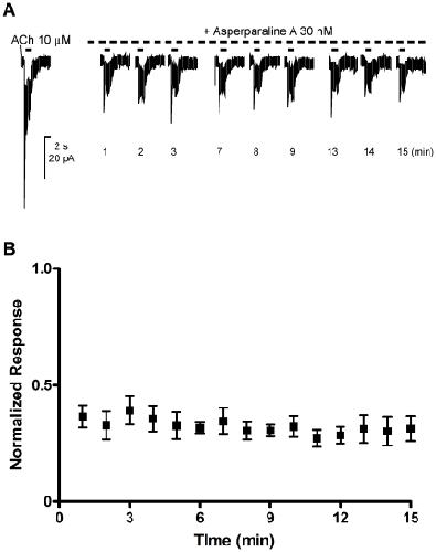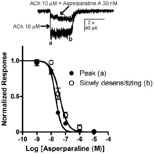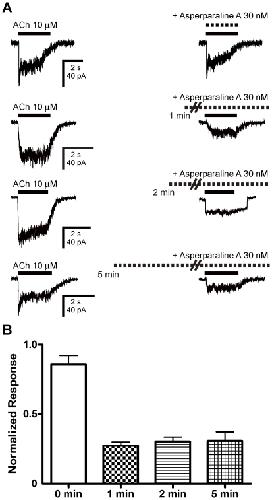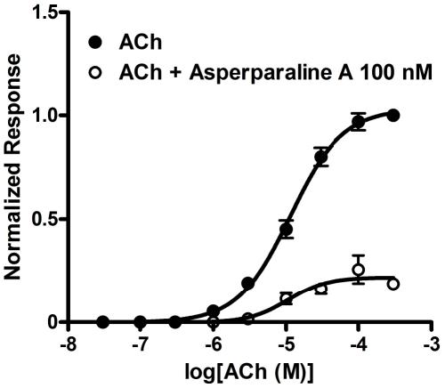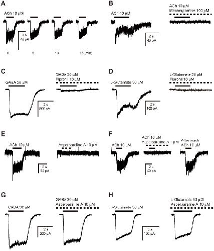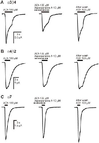 Asperparalines produced by Aspergillus japonicus JV-23 induce paralysis in silkworm (Bombyx mori) larvae, but the target underlying insect toxicity remains unknown. In the present study, we have investigated the actions of asperparaline A on ligand-gated ion channels expressed in cultured larval brain neurons of the silkworm using patch-clamp electrophysiology. Bath-application of asperparaline A (10 µM) had no effect on the membrane current, but when delivered for 1 min prior to co-application with 10 µM acetylcholine (ACh), it blocked completely the ACh-induced current that was sensitive to mecamylamine, a nicotinic acetylcholine receptor (nAChR)-selective antaogonist. In contrast, 10 µM asperparaline A was ineffective on the γ-aminobutyric acid- and L-glutamate-induced responses of the Bombyx larval neurons. The fungal alkaloid showed no-use dependency in blocking the ACh-induced response with distinct affinity for the peak and slowly-desensitizing current amplitudes of the response to 10 µM ACh in terms of IC(50) values of 20.2 and 39.6 nM, respectively. Asperparaline A (100 nM) reduced the maximum neuron response to ACh with a minimal shift in EC(50), suggesting that the alkaloid is non-competitive with ACh. In contrast to showing marked blocking action on the insect nAChRs, it exhibited only a weak blocking action on chicken α3β4, α4β2 and α7 nAChRs expressed in Xenopus laevis oocytes, suggesting a high selectivity for insect over certain vertebrate nAChRs.