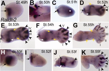 Figure 3. Cyp26a is expressed interdigitally during mid to late limb development. Dark blue stain indicates expression, roman numerals indicate digit identity. AâD:Cyp26a expression in hindlimbs at stages 51 to 55. A:Cyp26a is not expressed at st. 51. B: At st. 53, a diffuse staining can be seen in the distal 2/3 of the limb, with the proximal limit marked by white arrows. C: At st. 54 Cyp26a is expressed between digits IV and III and III and II, marked by black arrowheads. D:Cyp26a is expressed between all five digits at st. 55 (black arrowheads), in two stripes at the base of each forming digit (yellow arrows), and in two stripes in the anterior limb (white arrows). |