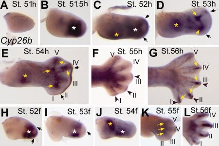 Figure 4. Cyp26b expression is distal in early limbs and restricted to the forming autopod skeleton and claws later. Cyp26b expression in hindlimbs (h) and forelimbs (f). Limbs are oriented with proximal to the left and posterior uppermost viewed from the dorsal side except L, which is a ventral view. A:Cyp26b is not expressed in early st. 51 hindlimbs. B, H: Strong expression (white asterisk) in the distal half of mesenchyme is seen by late st.51/early st. 52 hindlimbs (B) and st. 52 forelimbs (H) with the exception of the distal-most cells. From st. 52, the extent of expression in the most distal mesenchyme cells underlying the AER is marked by black arrows (C, H). Note that this never reaches as far as digit V. A more proximal domain of expression appears at stage 52 in hindlimbs (yellow asterisk in C). D: Yellow arrows mark expression in metatarsals in st. 53 hindlimbs. I: St. 53 forelimbs show no expression of Cyp26b in the autopod. E: Expression in hindlimb metatarsals of digits IV and II and phalanges of digits V and IV at st. 54 (yellow arrows). J: Forelimbs at st. 54 show no expression of Cyp26b in the autopod. F:Cyp26b is expressed in the most distal mesenchyme of toes I, II, and III (black arrowheads) but is absent from toes IV and V and from forelimb digits (K). G: At stage 56, Cyp26b is expressed in forming claws of toes IâIII (arrowheads) and in distal most phalanges of digits IâIV (yellow arrows). L: Ventral view of st. 56 forelimb reveals expression in all four digits. |