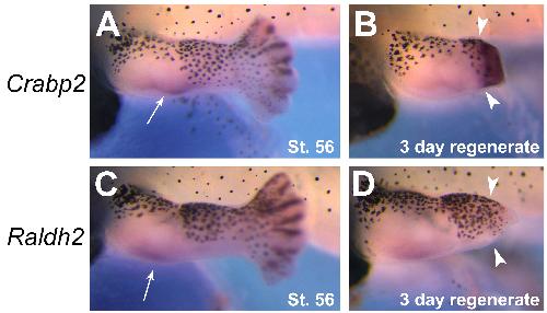 Supporting Information Figure 1. Whole mount in situ hybridisation showing expression of Crabp2 and Raldh2 in st. 56 hindlimbs and equivalent 3-day regenerates amputated at knee level at st. 56. Arrows indicate Crabp2 and Raldh2 expression in the anterior knee (A, C). Crabp2 (B) but not Raldh2 (D) shows expression in the pseudoblastema, which will not regenerate. White arrowheads mark the plane of amputation. Scale bars = 1 mm. Limbs are oriented with proximal to the left and posterior uppermost, and viewed from the dorsal side. |