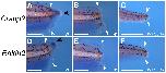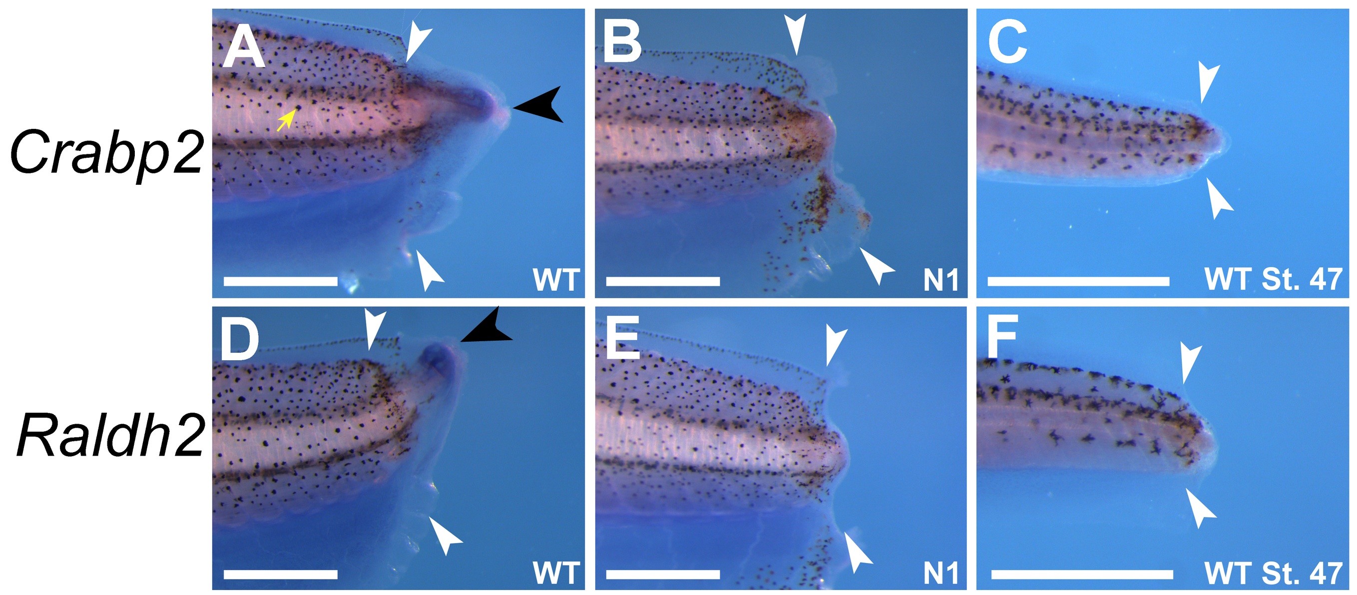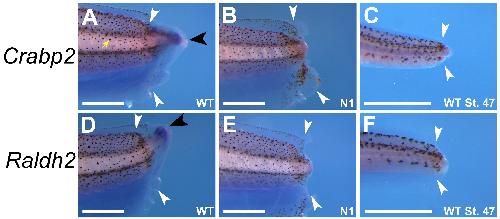 Supporting Information Figure 2. Whole mount in situ hybridisation showing expression of Crabp2 and Raldh2 in 3-day tail regenerates for wildtype st. 50 (WT) transgenic st. 50 (N1) and refractory st. 47 (st 47) tadpoles. The animals were subjected to a heat shock at 34 for 30 min and the posterior 50% of the tail was removed 3 hr later. Daily heat shocks were used to maintain transgene expression. Black arrowheads indicate Crabp2 and Raldh2 expression in the regenerating tail blastema (A, D). There is no regeneration and no expression of either gene in N1 tail stumps (B, E) or in refractory st. tails (C, F). White arrowheads, plane of amputation; yellow arrow in A, a pigment cell (melanophore). Scale bars = 1 mm. Tadpoles are oriented with anterior to the left and dorsal uppermost. |