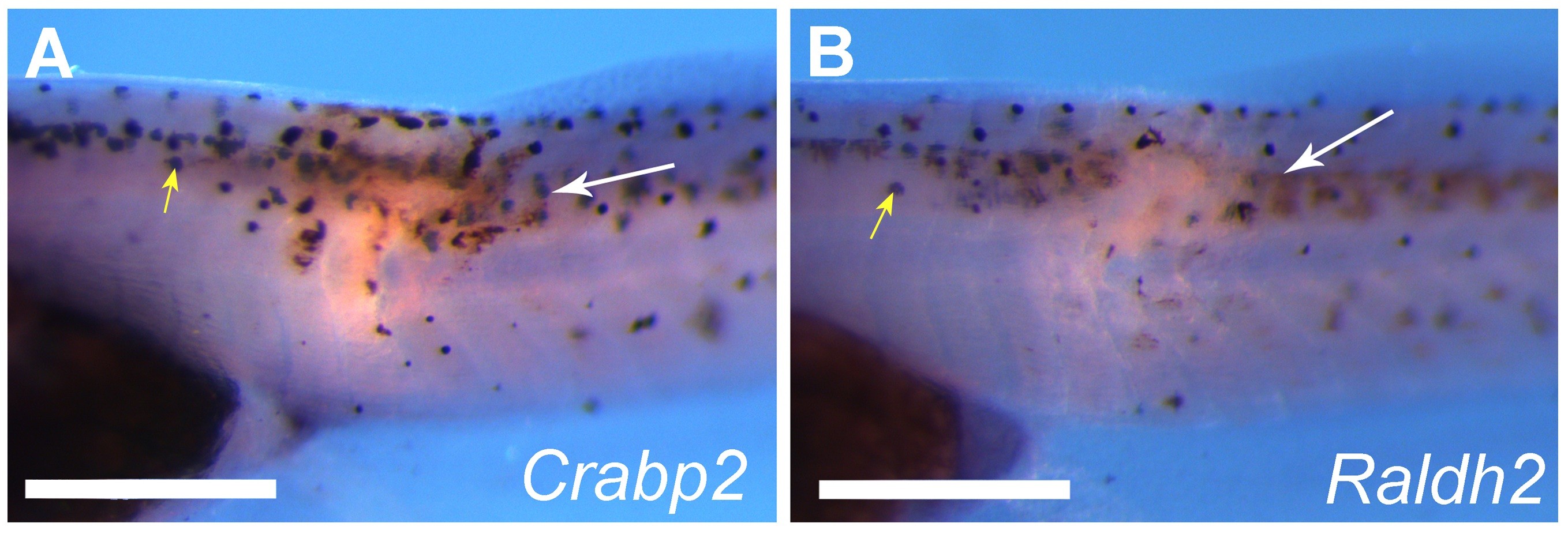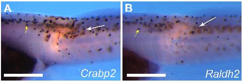 Supporting Information Figure 3. Wholemount in situ hybridisation for Crabp2 and Raldh2 expression in wounded tadpole tails. Neither gene is expressed as a result of wounding. The yellow arrow indicates a melanophore and white arrows indicate the position of the wound site. Scale bars = 1 mm. Tadpoles are oriented with anterior to the left and dorsal uppermost. |