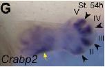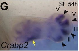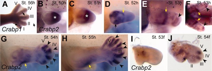 Figure 5. Expression of Crabp1 and Crabp2 in limb development. In situ hybridisation of Crabp1 and 2 in hindlimbs (h) and forelimbs (f); dark blue stain indicates expression. A:Crabp1 is expressed weakly in the skeleton of digits I to III, as seen in the ventral view of a hindlimb at st. 56. BâJ: Crabp2 expression in developing limbs. B: At st. 50, Crabp2 is expressed in the distal half of the limb bud (white asterisk) except the most distal mesenchyme cells and the epithelium. C: At st. 51, expression is limited to the central third of the mesenchyme (white asterisk). D: By st. 52, Crabp2 is expressed in patches of cells in the proximal half of the limb (black arrow), with expression also in the forming knee region (yellow arrow). E, F: Expression at the level of the knee (yellow arrow) and autopod mesenchyme (black arrowhead), in dorsal (E) and ventro-anterior (F) views of the st. 53 hindlimb. G, H: At st. 54 and 55, interdigital expression of Crabp2 (black arrowheads) is strong and there is also expression at the knee level in the anterior (yellow arrow). I, J: Dissected forelimbs showing no clear expression of Crabp2 at st. 53 and interdigital expression beginning at st. 54. |