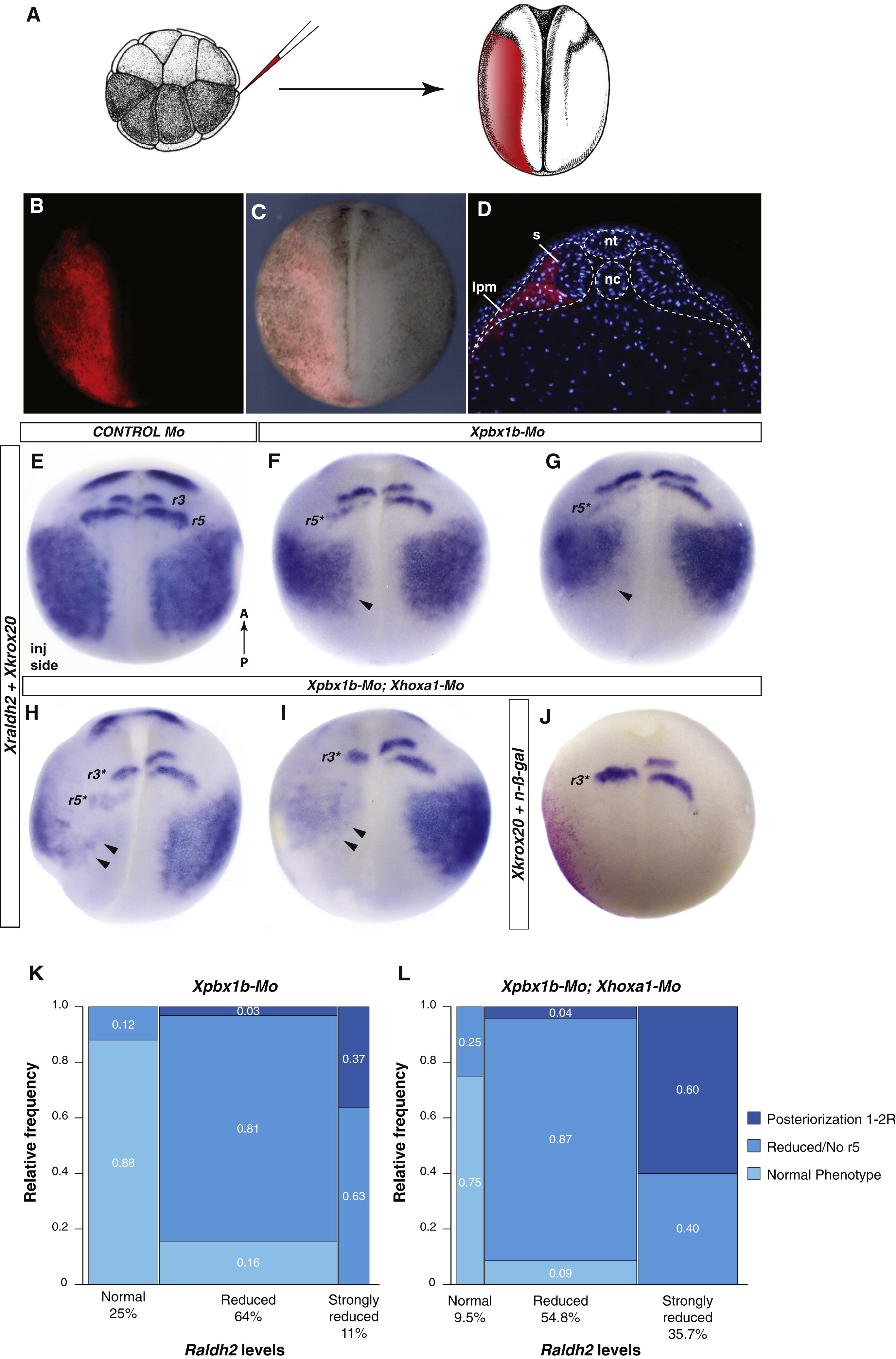Fig.4. Mesoderm-Specific Xpbx1 and Xhoxa1 Knockdown in Xenopus Embryos(A) Diagram of marginal zone V2.2 Xenopus blastomere injection at 16-cell stage, and fate of injected blastomere in stage 17 neurula.(B) Whole-mount detection of RFP in left V2.2 blastomere-injected embryo.(C) Merge of bright field and fluorescence pictures of the embryo in (B).(D) Cross-section showing selective RFP labeling in somites (s) and lateral plate mesoderm (lpm).(EâI) Whole-mount double in situ hybridization for Xraldh2 and Xkrox20 in control-MO (E), Xpbx1b-MO (F and G), and Xpbx1b-MO;Xhoxa1-MO (H and I) left V2.2 blastomere-injected embryos.(J) Nuclear-salmon-gal staining (red cells) of Xpbx1b-MO;Xhoxa1-MO V2.2-injected embryos indicate morphant cell localization in mesoderm. Xkrox20 expression shows r3* posteriorization and r5* loss on the injected side.(K and L) Correlation between Xraldh2 downregulation and hindbrain phenotype in Xpbx1b-MO and Xpbx1b;Xhoxa1-MO injected embryos (mosaic plots). Relative phenotype severity is color-coded. Phenotype frequencies (y axis) are compared to levels of Raldh2 (x axis). Synergistic action of Xpbx1b-MO;Xhoxa1-Mo results in rising the frequencies of Xraldh2 severe reduction or loss and hindbrain patterning defects. MO, morpholino; r, rhombomere; RFP, Red Fluorescent Protein.See also Figure S2.