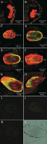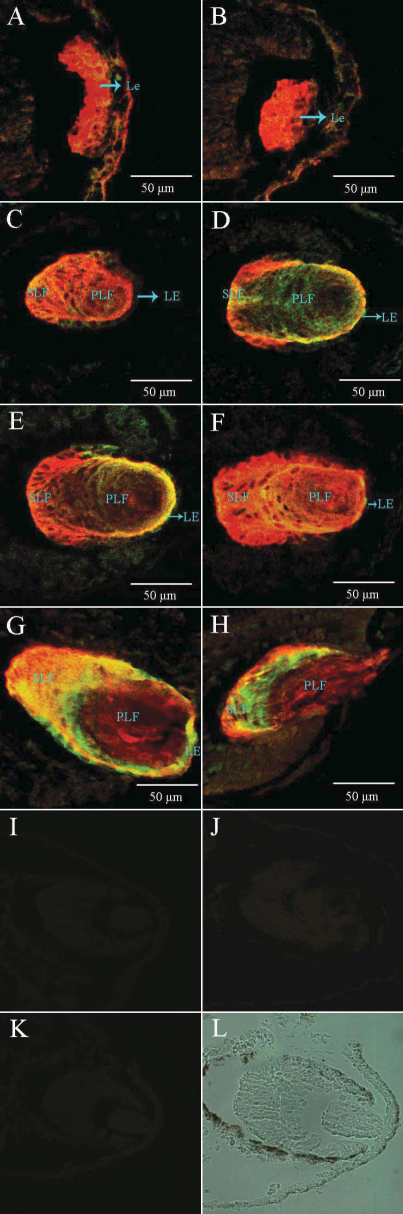 Figure 4. Immunofluorescence for αA-crystallin and βB1-crystallin during embryonic lens development. Sections double-stained with αA-crystallin and βB1-crystallin antisera at different developmental stages, analyzed by confocal microscopy. Some cells express predominantly βB1-crystallin (red) and some αA-crystallin (green). Overall, there is a strong co-localization of these two crystallin proteins throughout the lens cells. First positive immunofluorescence was detected at stage 29/30 (A). At stage 32 (B), a number of cells in the area of the lens rudiment where lens fibers will form. With further differentiation, the lens primary fibers and secondary primary fibers are formed during stage 34–46 (C-H). Negative controls: I (without antibodies); J (only secondary antibodies); K (only primary antibodies); L: differential interference contrast (DIC). Abbreviations: Le, lens; PLF, primary lens fiber; SLF, secondary lens fiber.