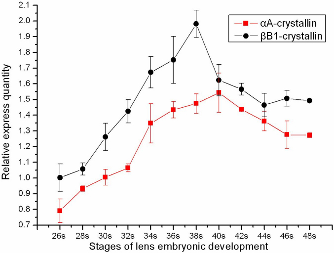Figure 2. Real-time PCR analysis for transcripts of αA-crystallin and βB1-crystallin during the lens development. Stages are according to the normal table of Nieuwkoop & Faber. The red curve illustrates the relative expression of transcripts of αA-crystallin. From the beginning of expression at stage 26 to stage 38, it displayed an increasing trend. After stage 38, the expression began to decrease. Finally, the expression quantity maintained at a relative stable level. The same went for βB1-crystallin, which is shown by the black curve.