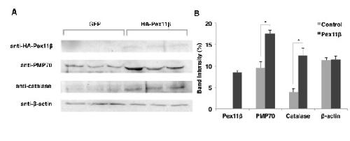 Figure 2. Overexpression of HA-Pex11β in A6 cells increased catalase and PMP70 protein levels. Western blotting revealed elevated proteins levels of catalase and PMP70 following the transfections of HA-Pex11β, but not GFP, in three samples of A6 cells (A). An HA antibody confirmed the translation and presence of HA-Pex11β in transfected cells (right 3 lanes) versus GFP transfected control cells (left 3 lanes). Catalase and PMP70 antibodies also displayed altered band intensities of each respective protein in HA-Pex11β transfected cells (right 3 lanes) versus GFP transfected cells (left 3 lanes). Protein loading in each lane was confirmed via a β-actin antibody. The Western blot signals were digitized and data were quantified and analyzed to statistically compare protein levels (B). There was a significant increase in the levels of catalase and PMP70 following overexpression of Pex11β, while there was no difference in the levels of β-actin. Statistical relevance of discrepancies between groups (asterisks) was assessed by an independent samples t-test. P < 0.05, n = 3. Values presented are the means ± SE. |