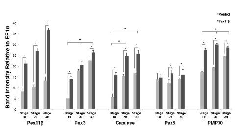 Figure 4. Embryonic overexpression of HA-Pex11β elevated Pex3, catalase and PMP70 levels. The respective mRNA levels represent measures of mid-log phase RT-PCR product band intensities, relative to levels of EF1α. RT-PCR analysis during normal embryogenesis revealed that the levels of all genes examined, with the exception of Pex5, increased as development progressed. First, repeated measures ANOVAs were carried out entering all RNA levels at all 3 stages. When significant, paired samples t-tests were carried out between stage levels in control embryos. This would reveal significant changes in RNA levels of the genes examined during normal development. Significant changes in RNA levels of a gene between stages is represented by the double asterisk ** (P < 0.05). Expression increases with development and there are differences in the levels of Pex3 and PMP70 between all stages, 10vs20, 20vs30 and 10 versus 30. For catalase there are differences between stages 10vs20 and 10vs30 but NOT between 20 versus 30. There are no significant differences in RNA levels between the tested developmental stages for Pex11β or Pex5. As the means were correlated, MANOVAs were carried out on the mean RNA levels of the treatment and control groups at each stage for each gene. All MANOVAs displayed significant effects of condition (Wilks lambda, P < 0.05) and so univariate ANOVAs were carried out. Treatments that resulted in significantly higher levels of gene expression following treatment are represented by a single asterisk. Pex11β, catalase and PMP70 all displayed significant increases in RNA levels all stage 10, stage 20 and stage 30 following treatment. Pex3 displayed elevated expression at only stage 10 and 30, while Pex5 displayed differences only at stages 20 and 30. (Ps < 0.05). n = 3. Values presented are the means ± SE. |