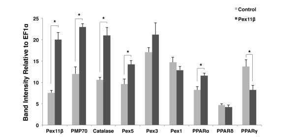 Figure 1. Overexpressing HA-Pex11β altered peroxisome related gene expression in Xenopus A6 cells. RT-PCR analysis of peroxisomal genes was performed before and after transfection of A6 cells with HA-Pex11β. Two days following transfection 250 ng of reverse-transcribed A6 cell RNAs from control and treatment samples (n = 3) were subject to PCR amplification using specific primers for the peroxisome related genes; Pex11β, PMP70, catalase, Pex5, Pex3, Pex1, PPARα, -δ, and -γ. The respective mRNA levels represent measures of mid-log phase RT-PCR product band intensities, relative to levels of EF1α. Genes whose levels were altered significantly, as assessed by an independent samples t-test, are denoted with an asterisk. Pex11β, PMP70, catalase, Pex5 and PPARα displayed elevated levels of expression following treatment, while PPARγ displayed reduced expression. P < 0.05, n = 3. Values presented are the means ± SE. |