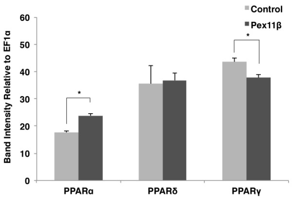 Figure 5. Overexpression of HA-Pex11β did altered PPARα and γ, but not δ, gene expression during early X. laevis embryogenesis. The respective mRNA levels represent measures of mid-log phase RT-PCR product band intensities, relative to levels of EF1α. Using a similar approach and analysis as used in Figure 4, RT-PCR analysis of RNA isolated from control stage 10 embryos and HA-Pex11β injected embryos revealed significant changes in the expression of PPARα, and PPARγ, but not PPARδ. PPARα levels were elevated by treatment, while PPARγ levels were reduced. P < 0.05, n = 3. Values presented are the means ± SE. |