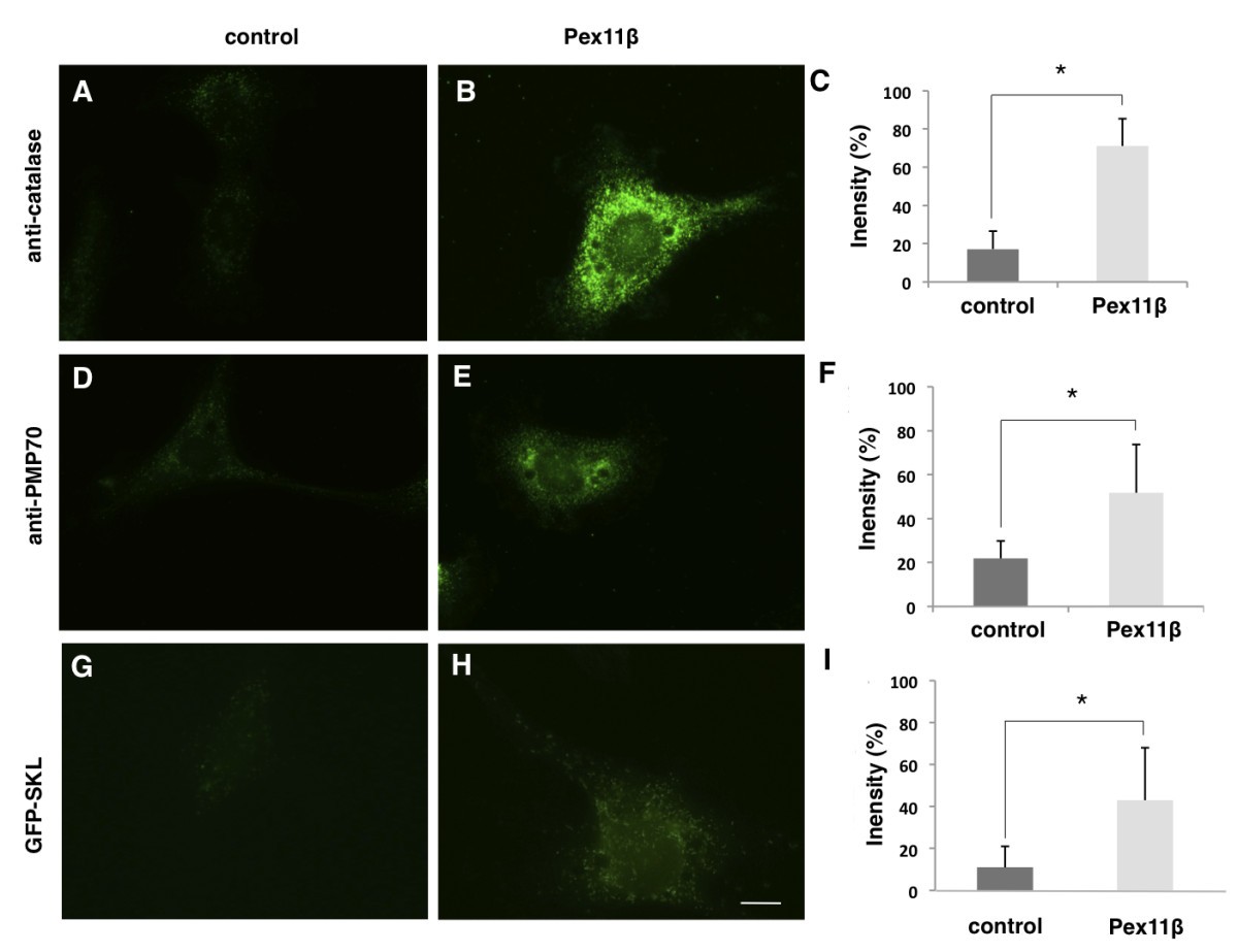 Figure 3. Overexpression of HA-Pex11β in A6 cells increased peroxisome numbers. A, D, G are untransfected cells, while B, E, H have been transfected with HA-Pex11β. G and H are additionally transfected with GFP-SKL. Using identical imaging and photography parameters, indirect immunofluorescence using a catalase antibody revealed lower levels of immunofluorescence in untransfected cells (A) versus transfected (B) cells. Similarly, indirect immunofluorescence using a PMP70 antibody revealed lower levels of signal in untransfected cells (D) versus transfected (E). Direct fluorescence for GFP revealed a diffuse signal from GFP in HA-Pex11β untransfected cells, (G) versus the presence of punctate structures in HA-Pex11β transfected cells (H). All images were captured using identical fluorescent settings. The relative fluorescence intensity in 10 regions of twenty randomly imaged cells was quantified using Northern Eclipse software. Graphs on the right represent the average fluorescence intensity of untransfected versus HA-Pex11β transfected cells. Values presented are the means ± SE. Significance at P < 0.05 was determined using Student's t-test, n = 25. |