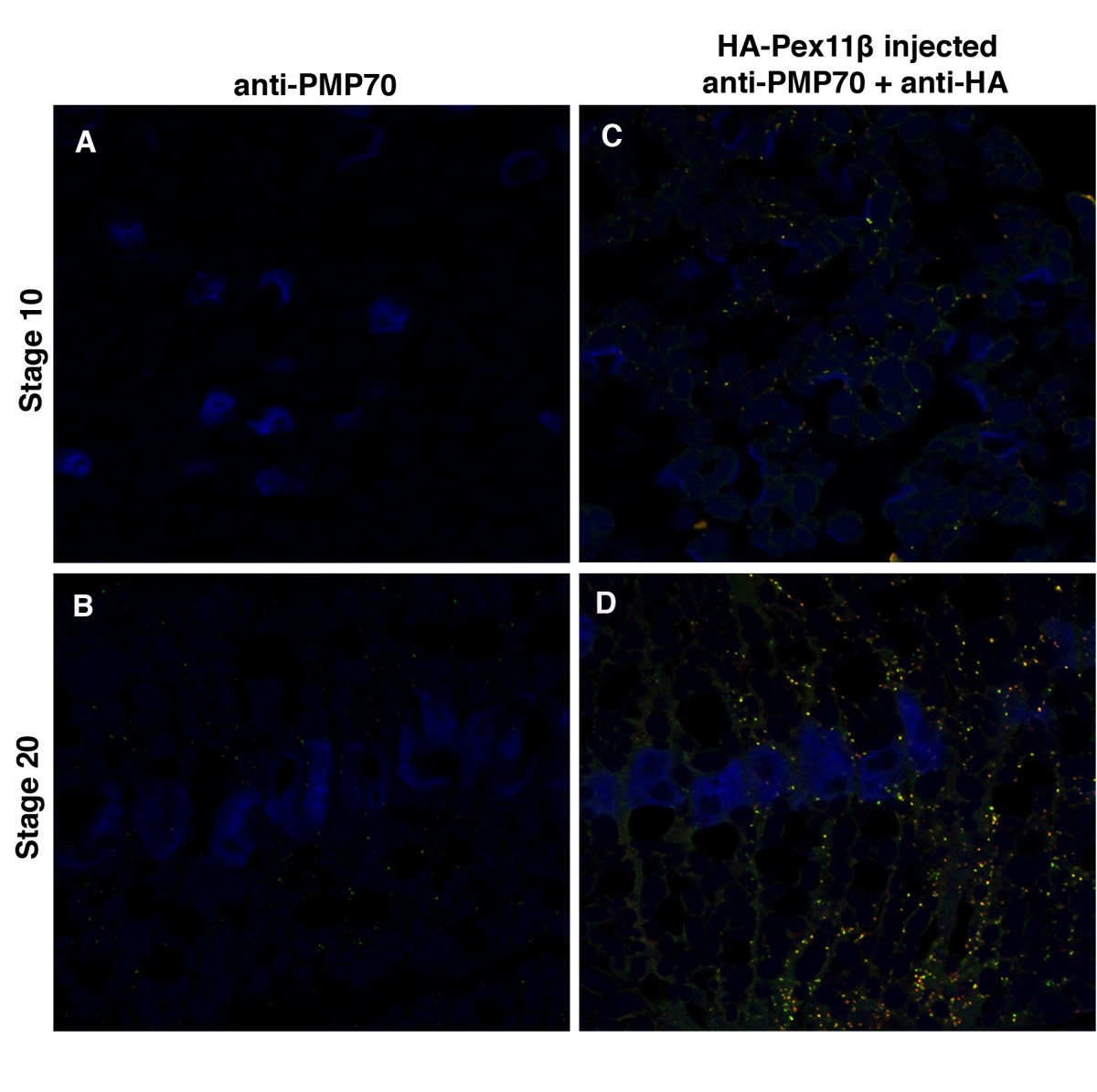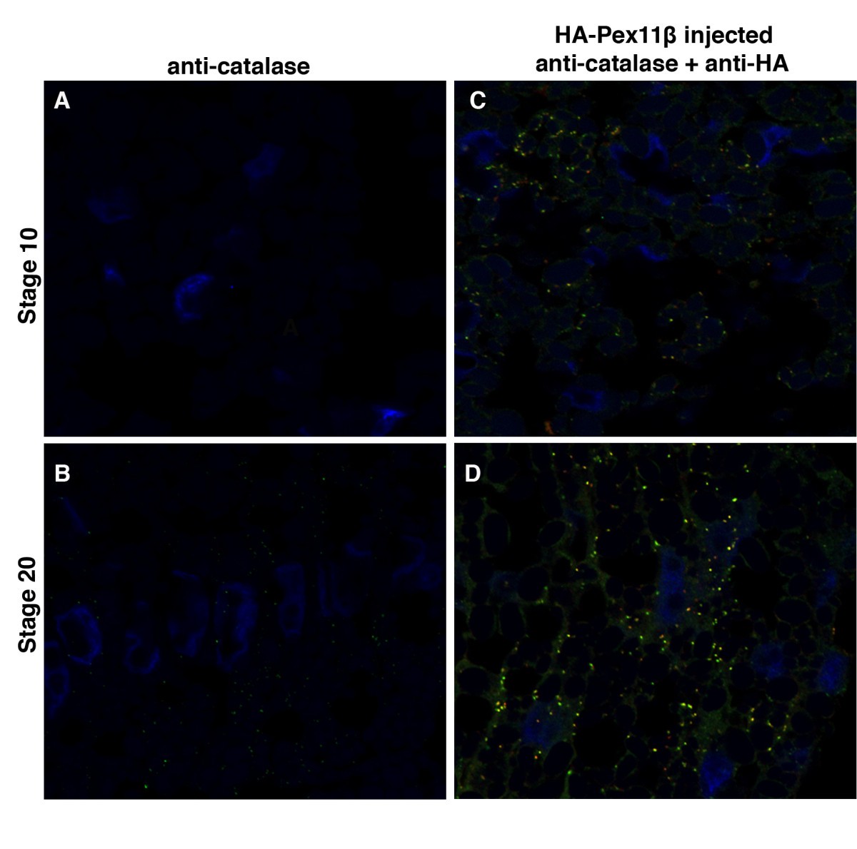 Figure 7. Microinjecting HA-Pex11β RNA increased catalase immunofluorescence levels during X. laevis embryogenesis. Both control (A and B) and HA-Pex11β injected (C and D) embryos at developmental stages 10 (A and C) and 20 (B and D), were fixed then sectioned for immunohistochemical analysis in somites for catalase. At stage 10 catalase protein is undetected in somitic mesoderm under control conditions (A), whereas following microinjection of HA-Pex11β catalase protein is detectable in punctate structures (C). At stage 20, PMP70 protein was detected in both control and following microinjecting HA-Pex11β (B and D). An HA antibody was also used to confirm the ectopic presence of HA-Pex11β. DAPI (blue), PMP70 (green), HA-Pex11β (red), colocalization of HA-Pex11β and PMP70 (yellow). Images were taken at 60magnification.