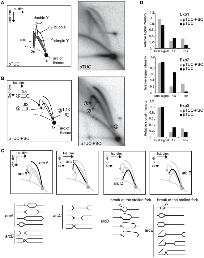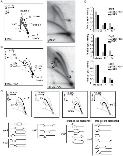 Figure 2. Two-dimensional gel electrophoretic analysis of pTUC and pTUC-PSO plasmids replicating in Xenopus egg extracts.Plasmids pTUC (A) and pTUC-PSO (B) were incubated 95 min in Xenopus egg extract in the continuous presence of [α-32P]-dATP. Plasmids were purified, linearized by AflIII digestion and analyzed by 2D gel electrophoresis. Phosphorimager images of the dried gels and interpretative diagrams are shown. (C) Interpretation of the pTUC-PSO specific arcs. (D) Relative intensity of total signal, 1x spot and replication intermediates (RIs) from 3 independent experiments (Exp1, Exp2, Exp3).