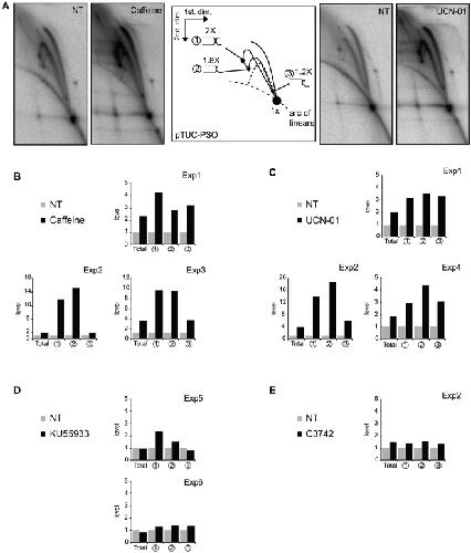Figure 4. Effect of ATR and Chk1 inhibition on processing of stalled replication forks at the psoralen ICL.(A) pTUC-PSO was incubated for 95 min in a Xenopus egg extract in absence (NT; not treated) or presence of 5 mM caffeine or 10 µM UCN-01 and [α-32P]-dATP and analyzed on 2D gels. Total signal and spots 1, 2 and 3 (as labeled on the interpretative diagram) were quantified in the presence of caffeine (B), UCN-01 (C), KU55933 (D) or C3742 (E). Results were normalized to the signals obtained with the non-treated plasmid. Exp1, Exp2, Exp3, Exp4, Exp5 and Exp6 are six experiments in six independently prepared egg extracts.