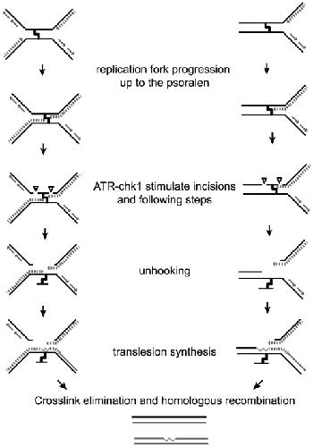 Figure 5. Model for psoralen ICL repair in Xenopus egg extract.During replication of plasmid DNA containing a single psoralen ICL, replication forks stall at the ICL advancing up to 1 nt from the lesion. Coordinated incisions of one parental strand around the lesion can occur whether one (right) or both (left) forks have stalled, resulting in unhooking of the lesion. Next, translesion synthesis occurs across the unhooked psoralen adduct and other events implying HR and/or NER regenerate two repaired duplexes as proposed elsewhere [5]. Both incision events and subsequent processing of the broken replication intermediates are stimulated by the ATR-Chk1 pathway.