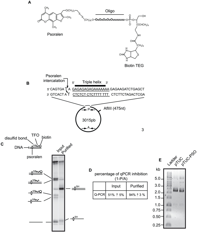 Figure 1. TFO and purification of monomodified plasmid.(A) Structure of the TFO linked in 3′ to 4, 5′, 8-trimethylpsoralen and in 5′ to biotin. (B) Localization of the TFO binding site and position of the psoralen ICL on pTUC plasmid. P and A are schematic representations of primers for q-PCR used in (D). P primers surround the psoralen ICL site and amplify a region of 113 nt, the A primers amplify an undamaged regions of 129 nt. (C) Analysis of the crosslinked plasmid after UV irradiation and before (input) or after (purified) DTT elution from a strepatvidin column. DNA was digested with BamHI + EcoRI and radioactively labelled before electrophoresis on a 10% polyacrylamide denaturing gel. Interpretative diagrams of the relevant molecular species are shown on lane sides. (D) Input and purified plasmids were subjected to q-PCR with primers P and A. Mean values of 3 q-PCRs for the input and 12 q-PCRs for the purified plasmid are presented. For calculation details see Material and Methods. (E) After purification pTUC-PSO was analyzed on a 0.8% agarose gel TBE 1x alongside with control plasmid and a molecular weight ladder.