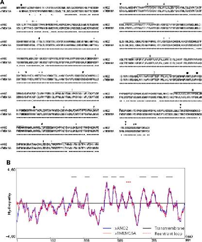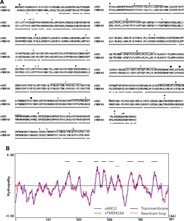Primary structure analysis of X. laevis anoctamins. (A) Amino acid (aa) alignment was deduced by querying the xANO2 aa sequence using GENETYX. The aa homology is indicated as follows: identical (asterisk), similar (dot). The putative transmembrane regions are marked by an upper line. Consensus sites are marked for N-linked glycosylation (●), phosphorylation by PKA (▾), PKC (+), PKG (■), casein II (#). (B) Hydrophobicity plots (Kyte–Doolittle analysis) of the anoctamin aa sequences. Both hydropathy plots were absolutely consistent in the overall region except for a short range at the amino terminus. The hydropathy plots were analyzed using an analysis window of 17 residues, and then overlapped. Hydrophobic domains are given as positive values. The proposed TM segments and reentrant loop are indicated by horizontal lines and dotted line, respectively.