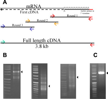 Construction strategy of full-length cDNA. (A) To obtain the full length of xANO2 cDNA, three rounds of PCR were carried out under appropriate conditions. Initial cDNA (dotted line) and PCR products (thick line) are depicted with black lines. 3′-RACE products are represented as Round 1 and 5′-RACE products are represented as Round 2 and 3. (B) PCR products of 3′-RACE (left, Round 1) and 5′-RACE (middle: Round 2, right: Round 3) were electrophoresed in a 1% agarose gel. Black arrowheads indicate the 2.0, 0.7, and 1.7 kb target products. (C) Full-length PCR product of X. laevis TMEM16A gene. The 3012 base pair (bp) cDNA (xTMEM16A) was amplified by gene specific primers: CAN3 and CAN5.