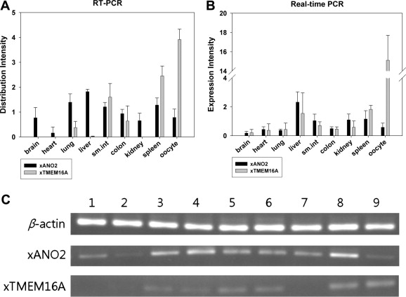 Fig. 3. Comparison of anoctamin expression in X. laevis by reverse transcriptase (RT)-PCR and real-time PCR. Each expression level of anoctamins was normalized with β-actin used as internal control. (A) Bar graphs of RT-PCR. One round of PCR was carried out with 38 repeats to determine the specific products of xANO2, xTMEM16A, and β-actin gene. Each specific product of xANO2, xTMEM16A, and β-actin gene was amplified by RT-PCR. The β-actin gene was used as an internal control. Lanes 1â9 represent brain, heart, lung, liver, small intestine, colon, kidney, spleen and oocyte, respectively. (B) Quantitative histogram of real-time PCR. Real-time PCR was carried out with 50 repeats for quantitative analysis for anoctamin expression in X. laevis tissues. (C) Tissue distributions of anoctamin mRNA expression. Quantitation of anoctamin is shown as a bar graph compared to RT-PCR.