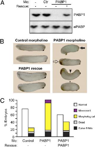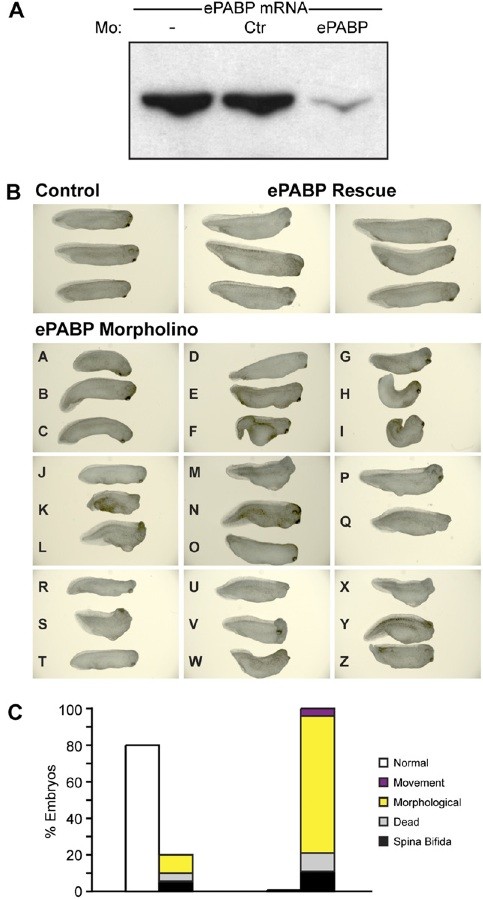 Fig. S4. ePABP depletion causes widespread developmental defects. (A) Western blot analysis of whole-cell extracts from stage VI oocytes coinjected with an ePABP-expressing mRNA � control (Ctr) or ePABP-A (ePABP) morpholino, using an ePABP-specific antibody. This shows that ePABP expression is inhibited efficiently in vivo by the morpholino. (B) Representative photographs of stage 30�32 embryos injected with control or ePABP-A morpholino � 10 ng of ePABP rescue mRNA. ePABP morphants display the following defects: spinal curvature (embryos A, B, C, H, V, W, Y); abnormal development of tail (embryos D, J); absence of posterior elongation (embryos A, F, G, K, S, Z); abnormal development of anterior structures (embryos K, L, M, Q, R, S, T, U, X, Y); and ventral edema (embryos E, F, I, K, L, M, N, S, Y). Embryo O appears morphologically normal. The majority of ePABP-rescued embryos do not show morphological defects. (C) An alternative ePABP morpholino (ePABP-B) causes the same developmental defects and lethality as ePABP-A. Embryos were injected with control or ePABP-B morpholino; percentages of stage 26�29 embryos displaying the indicated phenotypes are shown. Data represent the average of four independent experi- ments, with ∼500 embryos per experimental point. |