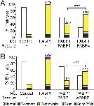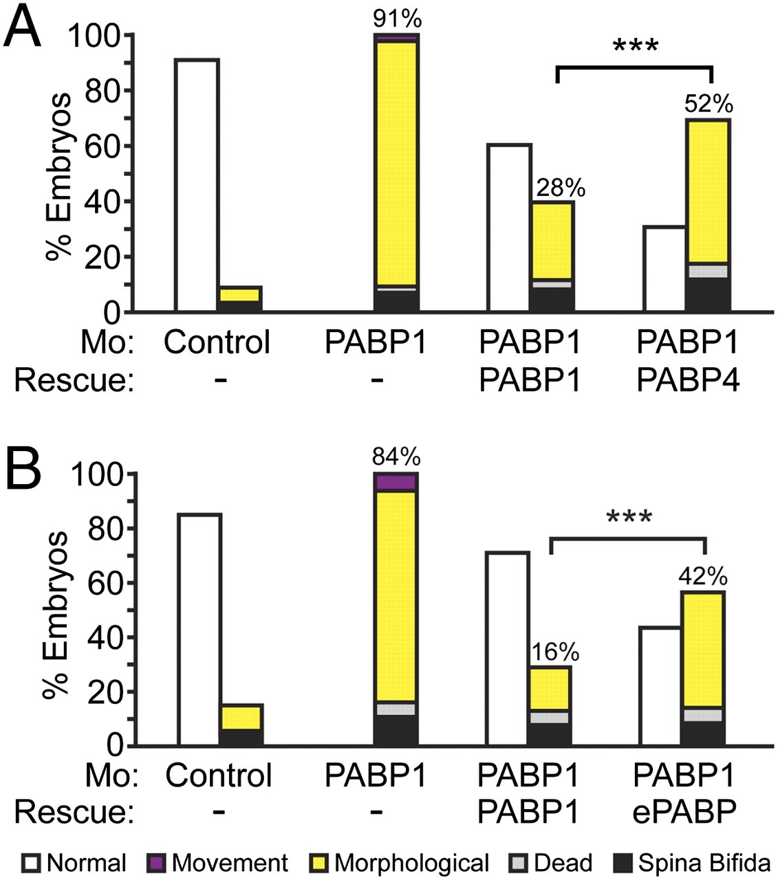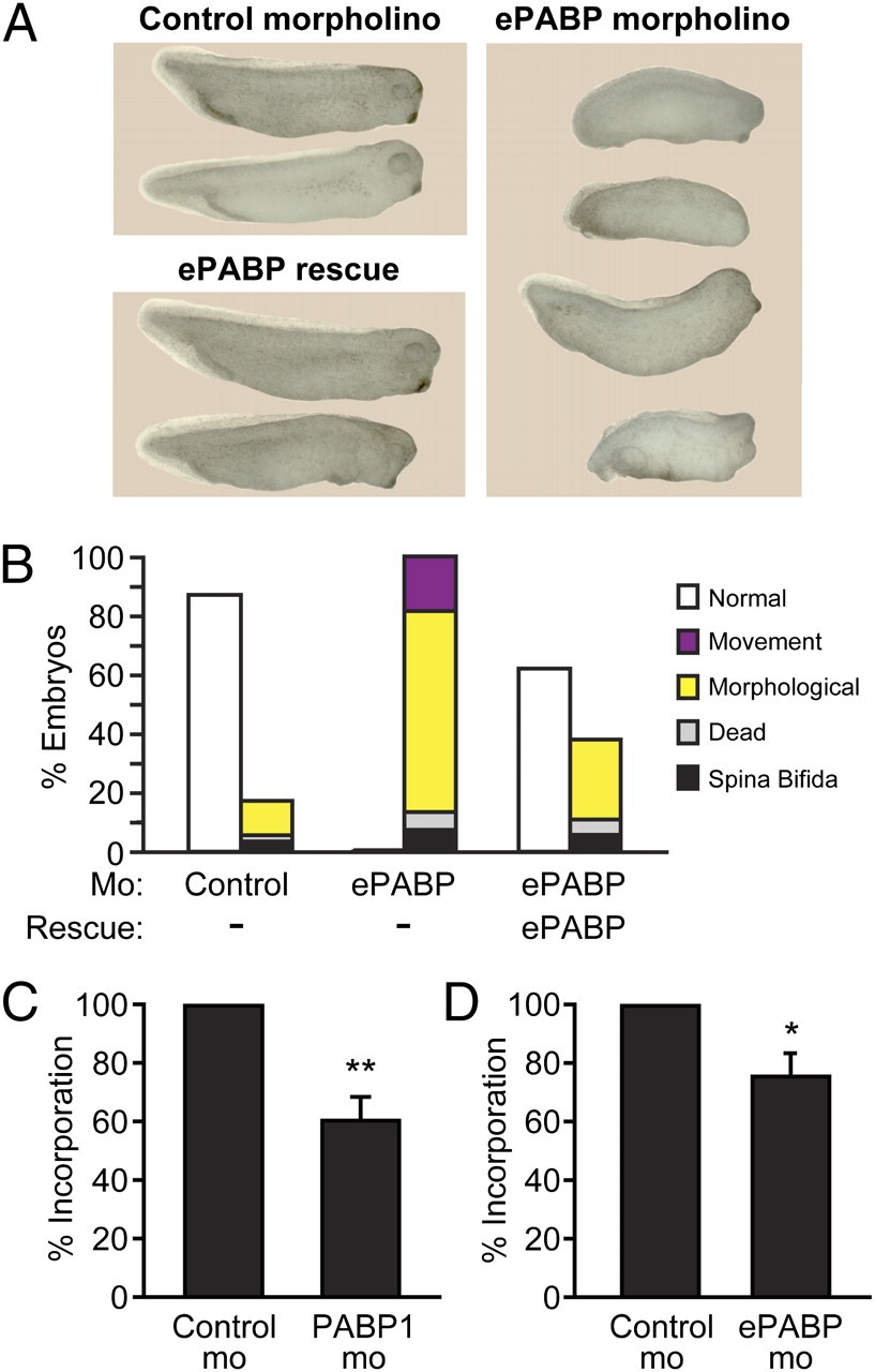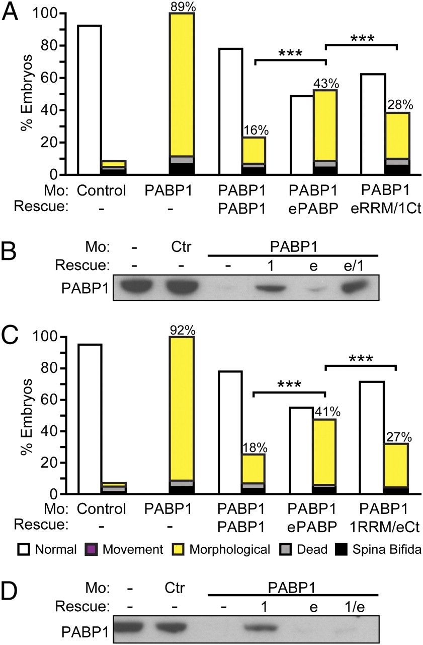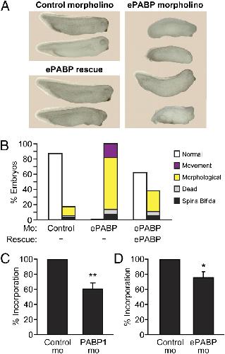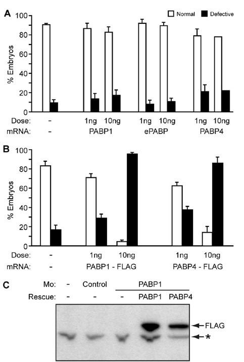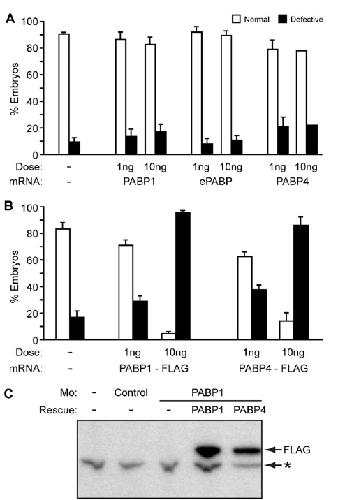 PABP4 and ePABP cannot rescue PABP1-depleted embryos efficiently. Embryos were injected with control or PABP1-A (PABP1) morpholino � (A) 1 ng of PABP1-FLAG or PABP4-FLAG rescue mRNA or (B) 10 ng of PABP1 or ePABP rescue mRNA. Percentages of stage 29/30 embryos displaying the indicated phenotypes are shown; numbers indicate the percentage of PABP1-specific phenotypes in each case (morphological plus movement defects). Data represent the average of approximately (A) 350 embryos or (B) 500 embryos per experimental point, in three or four independent experiments, respectively. ***P < 0.0001, as determined by Fisher's exact test. (Photographs are shown in Fig. S8 |