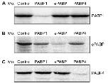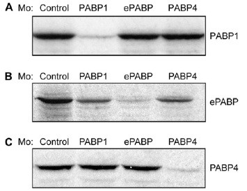 Fig. S1. Translation of PABPs is inhibited efficiently by specific morpholinos. (A) PABP1, (B) ePABP, or (C) PABP4 mRNA was translated in vitro in the presence of [35S]methionine and morpholino antisense oligos (Mo): Control, PABP1-A (PABP1), ePABP-A (ePABP), or PABP4. |