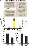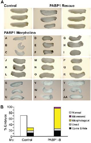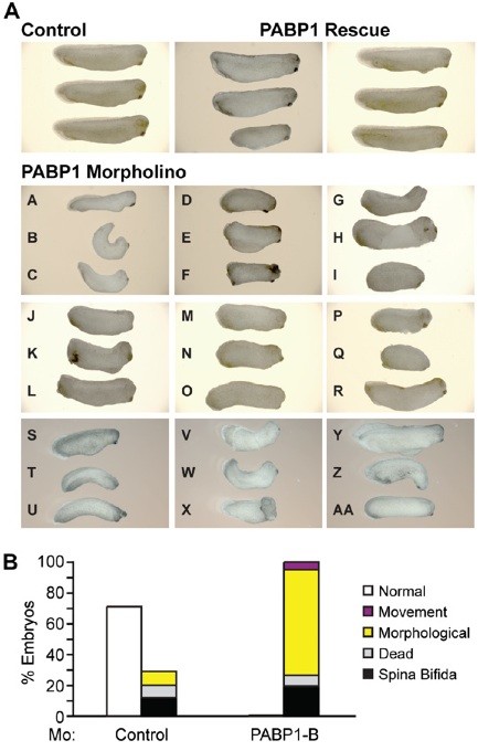 Fig. S2. PABP1 depletion causes multiple developmental defects. (A) Representative photographs of stage 29/30 embryos injected with control or PABP1-A (PABP1) morpholino � 10 ng of PABP1 rescue mRNA. PABP1 morphants display the following defects: spinal curvature (embryos B, C, G, H, K, O, R, T, U, V, W, Z); abnormal development of tail and/or fin (embryos G, H, L, O, AA); absence of posterior elongation (embryos D, E, F, J, K, M, N, P, V); abnormal development of anterior structures (embryos J, V, Z, AA); ventral edema (embryos A, E, K, S, Y); and developmental arrest (embryos I, Q). Most PABP1-rescued embryos do not show morphological or movement defects. (B) An alternative PABP1 morpholino (PABP1-B) causes developmental defects and lethality similar to those caused by PABP1-A. Embryos were injected with control or PABP1-B morpholino; percentages of stage 26 embryos displaying the indicated phenotypes are shown. Data represent the average of three independent experiments with ∼300 embryos per experimental point. |