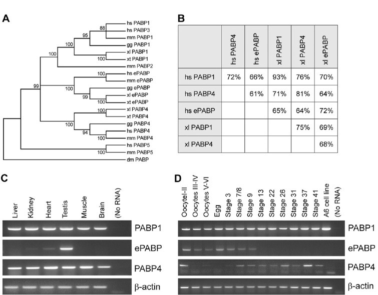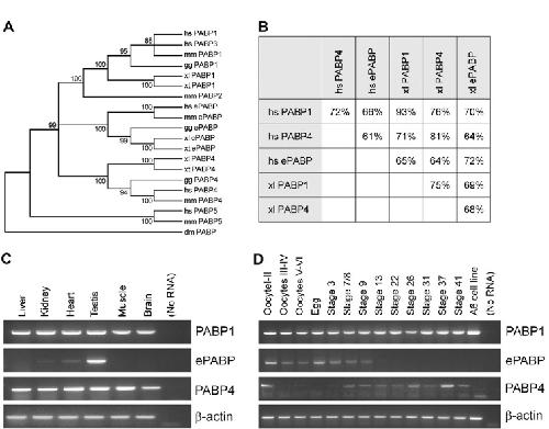 Fig. S5. PABP4 is conserved in vertebrates. (A) Neighbor-joining phylogenetic tree of vertebrate PABP family members rooted with Drosophila melanogaster (dm) PABP. Bootstrap (1,000 replicates) values are shown at the nodes. PABPs from Homo sapiens (hs), Mus musculus (mm), Gallus gallus (gg), X. laevis (xl), and Xenopus tropicalis (xt) are compared. (B) Table showing the percentage of amino acid identity between X. laevis and human PABP1, PABP4, and ePABP. (C and D) RT-PCR analysis of total RNA extracted from the indicated X. laevis adult tissues (C) or developmental stages (D) using primers specific for the indicated PABPs. β-actin serves as an internal control. In adults, ePABP mRNA is present only in the gonads, consistent with the protein expression (1, 2) whereas PABP1 and PABP4 mRNAs are widespread. During development, PABP4 mRNA is most abundant in early oocytes and after the midblastula transition (stage 7/8 embryos). Although ePABP protein levels begin to diminish after approximately stage 35 (2, 3), ePABP mRNA is absent after midblastula transition. Whilst PABP1 mRNA is present in all stages analyzed, PABP1 protein levels start to rise significantly only after stage 15, continuing to increase until approximately stage 41 (2, 3). |