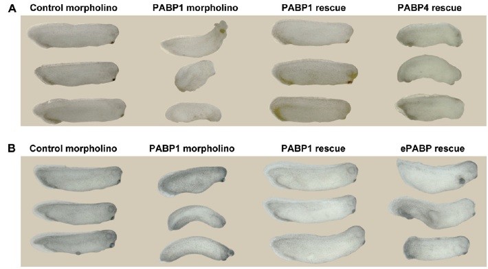 Fig. S8. PABP4 and ePABP cannot rescue PABP1-depleted embryos efficiently. (A) Representative photographs of stage 29/30 embryos injected with control or PABP1-A (PABP1) morpholino � 1 ng of PABP1-FLAG or PABP4-FLAG rescue mRNA. (B) Representative photographs of stage 29/30 embryos injected with control or PABP1-A morpholino � 10 ng of PABP1 or ePABP rescue mRNA. |