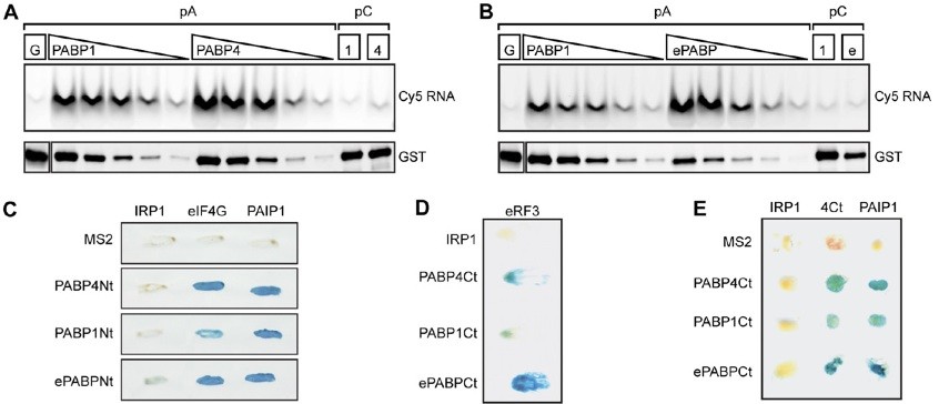 Fig. S7. PABP1, ePABP, and PABP4 activate translation through a similar mechanism. (A and B) PABP4, like PABP1 and ePABP, binds poly(A) but not poly(C) RNA efficiently. A range of concentrations (4, 2, 1, 0.5, and 0.25 nM) of GST-PABP1 and (A) GST-PABP4 or (B) GST-ePABP were immobilized on glutathione beads and incubated with 1 nM poly(A) RNA (pA). To control for specificity, 4 nM GST protein (G) was incubated with poly(A) RNA; and 4 nM PABP1 (1), PABP4 (4), and ePABP (e) were incubated with 1 nM poly(C) RNA (pC). After elution, RNA and proteins were detected by fluorescence (Top) and Western blotting with an anti-GST antibody (Bottom), respectively. (C) PABP4 interacts with initiation factors. Yeast two-hybrid analysis with the indicated PABP N termini (Nt) (LexA DNA-binding domain fusions) against eukaryotic initiation factor 4G (eIF4G) and poly(A)-binding protein interacting protein 1 (PAIP1) (Gal4 activation domain fusions) shows that PABP4 maintains these interactions. (D) The translation termination factor eukaryotic release factor 3 (eRF3) also is a PABP4 partner, as shown by yeast two-hybrid analysis with the indicated PABP C termini (Ct) (Gal4 activation domain fusions) against eRF3 (Gal4 DNA-binding domain fusion). (E) PABP4 can interact with itself and other PABP proteins. Yeast two-hybrid analysis with the indicated PABP C termini (LexA DNA-binding domain fusions) against the PABP4 C terminus (4Ct) or PAIP1 (Gal4 activation domain fusions) reveals PABP�PABP interactions. In C�E, iron regulatory protein-1 (IRP1) and MS2 are negative controls. Expression of β-galactosidase (blue) indicates protein�protein interaction. |