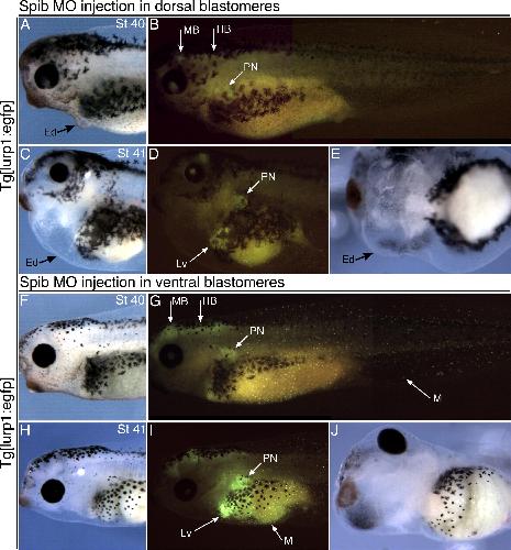 Fig.1. Heart defect in a tadpole after sustained spib morpholino inhibition of myeloid cell differentiation. (AâE) X. laevis Tg[lurp1:egfp] tadpole that was injected with Xtspib-e1i1MO into dorsal blastomeres, 40Â ng dose. Tadpole was photographed at stage 40 (A and B) and stage 41 (CâE), with fluorescence from eGFP shown (B and D). The complete inhibition of myeloid cell differentiation caused by loss of spib has been sustained to stage 40. A large edema formed during this time interval, indicative of cardiac dysfunction (A, C, E). (FâJ) Control sibling tadpole that was injected with the same morpholino into ventral blastomeres, photographed at stage 40 (F and G) and stage 41 (HâJ). Fluorescent embryonic macrophages can be seen distributed throughout the tadpole (G and I). Hematopoiesis also observed in pronephros and liver (G and I). No edema developed and heart morphology appeared normal. Anterior is to the left in lateral (AâD, FâI) and ventral (E and J) views. Ed, edema; M, myeloid/macrophage; PN, pronephros; Lv, liver; MB and HB, additional domains of Tg[lurp1:egfp] fluorescence in mid and hindbrain. |