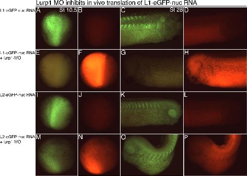 Supplementary Fig. 4 Target specificity of lurp1 translation-inhibiting morpholino. (AâD): Injection of 200 pg L1-eGFP-nuc RNA into one blastomere at the two-cell stage (1/2). Fluorescence viewed of same embryo at stage 10.5 (A and B) and stage 28 (C and D). (EâH): Similar injection of L1-eGFP-nuc RNA, followed by injection of 16 ng lurp1-MO (plus rhodamine-Dextran) to the same site at the four-cell stage. The lurp1-MO inhibits translation of the synthetic RNA in vivo. (IâL) Injection of 200 pg of control L2-eGFP-nuc RNA. (MâP) Similar injection of L2-eGFP-nuc RNA, followed by injection of 16 ng lurp1-MO. The lurp1-MO does not inhibit translation of the control RNA. Images of green fluorescence from eGFP and red fluorescence from rhodamine-Dextran are presented. Stage 10.5 embryos oriented with the blastopore at the bottom of each image while stage 28 embryos are lateral views. |