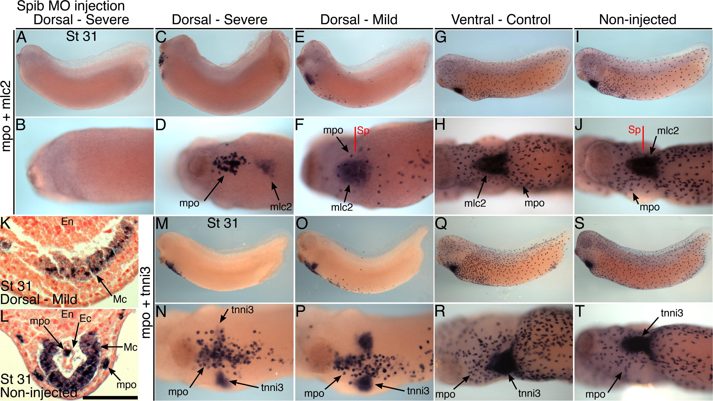 Fig.3. Spib morpholino affects myeloid cell production and also cardiac muscle morphogenesis. (AâJ) Stage 31 tadpoles injected with Xtspib-e1i1MO into dorsal blastomeres (AâF), 40 ng dose, or control ventral blastomeres (G and H), or non-injected sibling (I and J), hybridized with probes for mpo and mlc2 (myocardium). Two tadpoles with severe macrophage deficit are shown (AâD) and one with a milder reduction (E and F). Myocardial phenotype severity appears linked to the number of functional macrophages produced. Anterior is to left in lateral views and ventral view of heart-forming regions. (K and L) Transverse section through the myocardium of the mild phenotype tadpole (E, F, K) compared with non-injected control (I, J, L), Nuclear-Fast Red counterstained (NFR). Section plane indicated (Sp). Scale bar = 100 μm. En, endoderm; Mc, myocardium; Ec, endocardium. (MâT) Stage 31 tadpoles injected with the spib morpholino, 40 ng dose and with same sequence of blastomere injections presented. Tadpoles hybridized to mpo and tnni3 (myocardium). One tadpole is shown with severe macrophage deficit (M and N) and one with a milder reduction (O and P). |