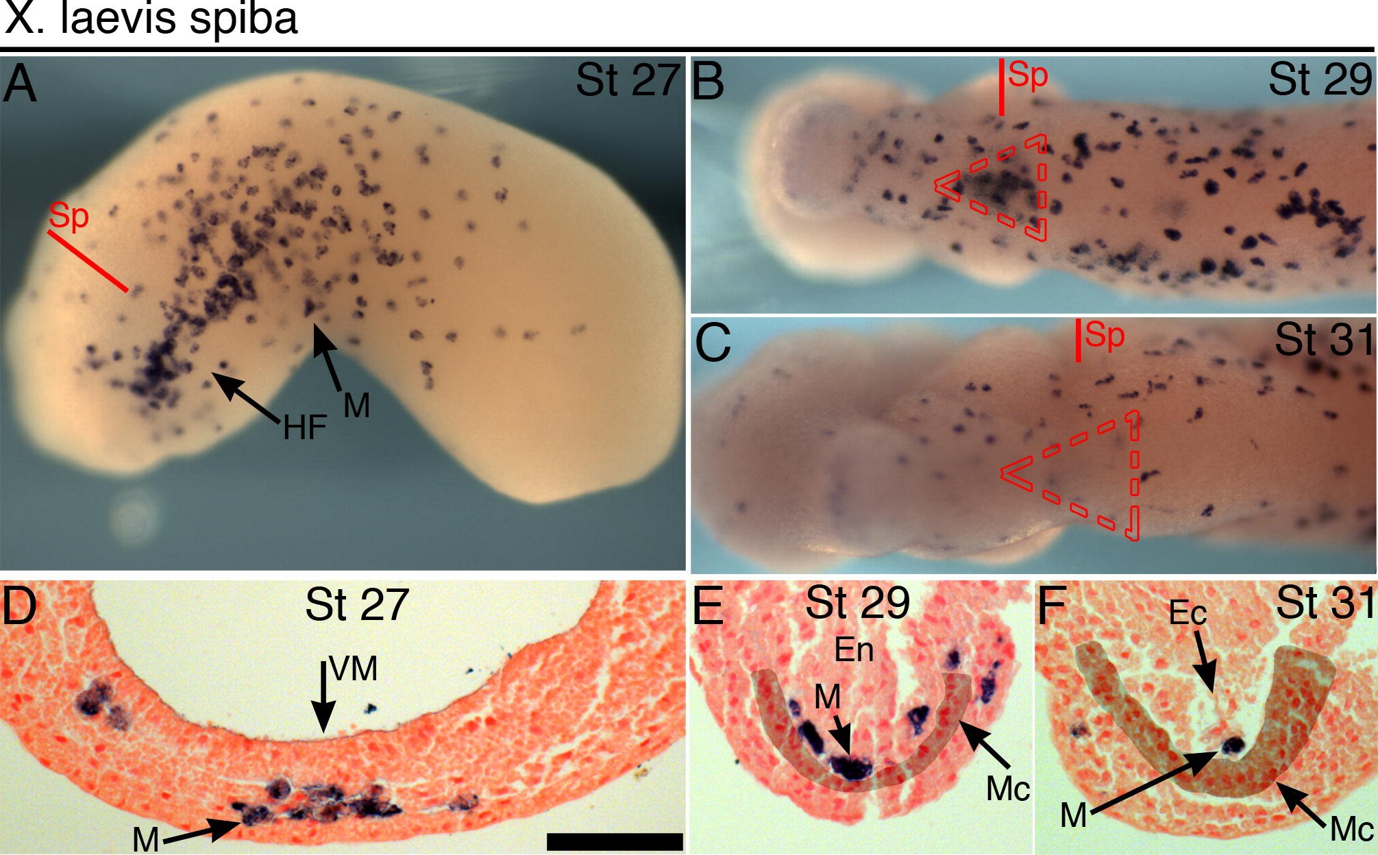 Fig.4. Spiba mRNA expression within the heart-forming region. (AâC) Wholemount in situ hybridization for myeloid spiba, ventral views of heart-forming region, at stage 27 (A), stage 29 (B) and stage 31 (C). Red triangle depicts position of forming myocardium (B and C). (DâF) Transverse sections through heart region of same embryos, with section planes depicted (AâC). Stage 27 (D), stage 29 (E) and stage 31 sections (F). To ease identification, the approximate position of the (myocardial) mesoderm has been artificially-darkened (E and F). NFR (DâF) nuclear counterstained. Scale bar = 100 μm. Sp, section plane; M, myeloid/macrophage; HF, heart field; Mc, myocardium; Ec, endocardium; VM, ventral midline; En, endoderm. |
