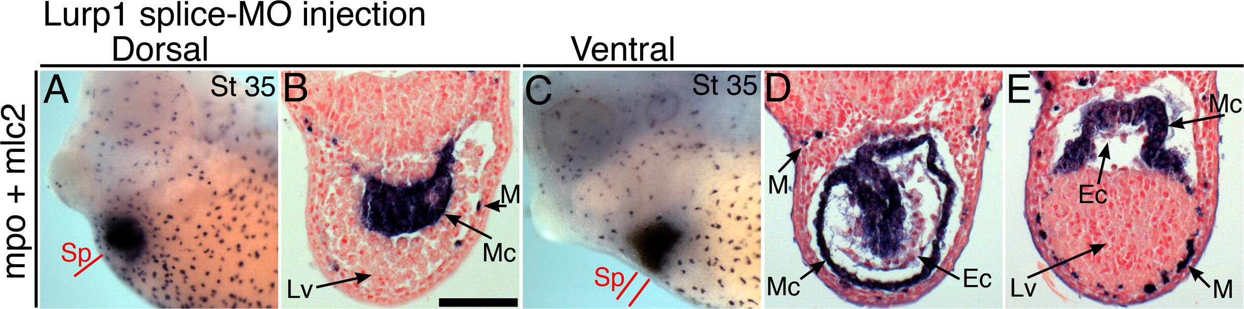 Supplementary Fig. 5 Lurp1 RNA splice-interfering morpholino similarly affects myocardial morphogenesis. (A and B) Stage 35 tadpole injected with Xllurp1-e2i2MO into dorsal blastomeres, 16 ng dose, hybridized to mpo and mlc2. The section plane (B) is indicated on the head (A). (CâE) Control tadpole with same morpholino in ventral blastomeres. Position of two sections (D andindicated (C). Scale bar = 100 μm. Sp, section plane; Mc, myocardium; Ec, endocardium; M, macrophage; Lv, liver. |
