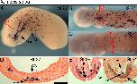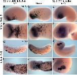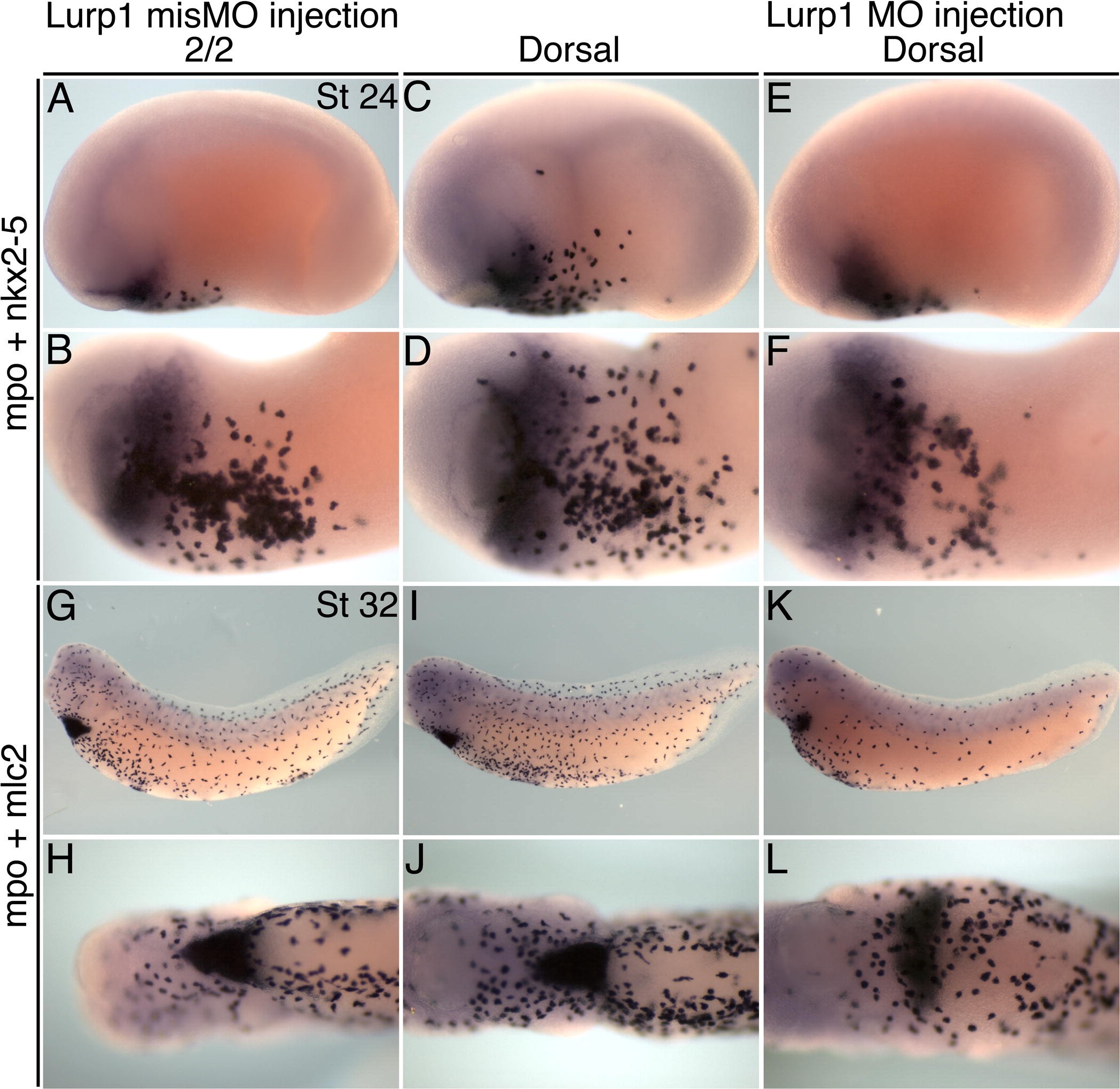 Supl. Fig. 7.Lurp1 mismatch morpholino does not affect Xenopus development. (AâD) Stage 24 embryos injected with the mismatch control morpholino, lurp1-misMO, into both blastomeres at the two-cell stage (A and B), 12 ng dose, or into dorsal blastomeres (C and D). Embryos hybridized to mpo and nkx2-5. (E and F) Sibling embryo injected with the active lurp1 morpholino into dorsal blastomeres at 12 ng dose. (GâJ) Stage 31 tadpoles with the same sequence of mismatch control lurp1 morpholino and hybridized to mpo and mlc2. (K and L) Sibling tadpole injected with the active lurp1 morpholino. Myeloid cell production and embryo development is unaffected by the mismatch control morpholino whereas the active morpholino causes macrophage migration from lateral positions and defective (broader) heart myocardium morphogenesis. |